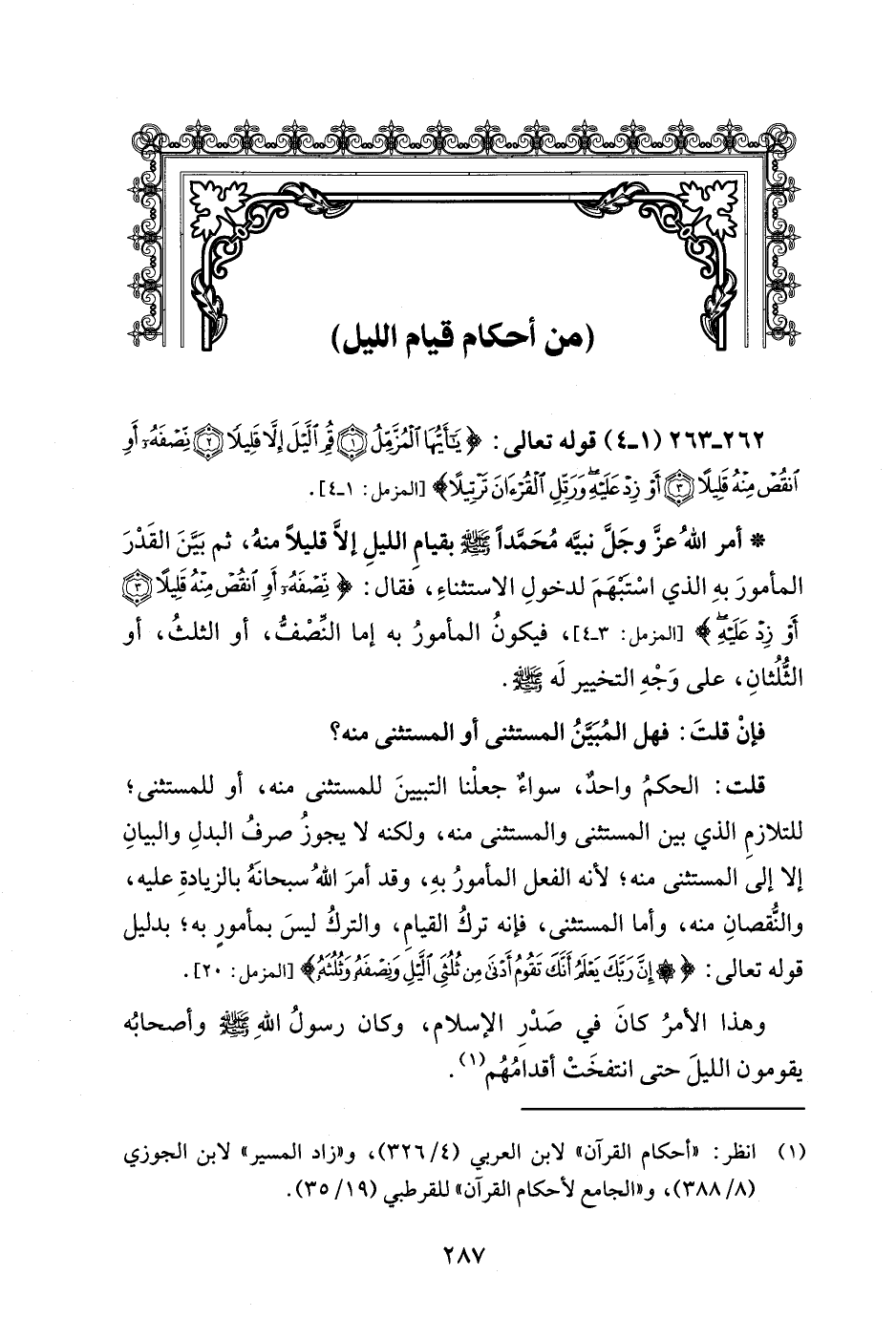 263 - 262 (1 - 4) قوله تعالى: {يَاأَيُّهَا الْمُزَّمِّلُ (1) قُمِ اللَّيْلَ إِلَّا قَلِيلًا (2) نِصْفَهُ أَوِ انْقُصْ مِنْهُ قَلِيلًا (3) أَوْ زِدْ عَلَيْهِ وَرَتِّلِ الْقُرْآنَ تَرْتِيلًا} [المزمل: 1 - 4].