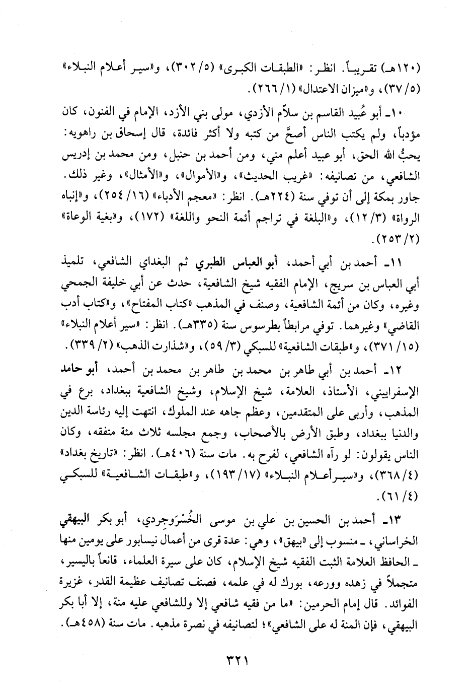 13 - أحمد بن الحسين بن علي بن موسى الخُسْرَوجردي، أبو بكر البيهقي الخراساني، -منسوب إلى "بيهق"، وهي: عدة قرى من أعمالَ نيسابور على يومين منها- الحافظ العلامة الثبت الفقيه شيخ الإسلام، كان على سيرة العلماء، قانعاً باليسير، متجملاً في زهده وورعه، بورك له في علمه، فصنف تصانيف عظيمة القدر، غزيرة الفوائد. قال إمام الحرمين: "ما من فقيه شافعي إلا وللشافعي عليه منة، إلا أبا بكر البيهقي، فإن المنة له على الشافعي"؛ لتصانيفه في نصرة مذهبه. مات سنة (458 هـ).