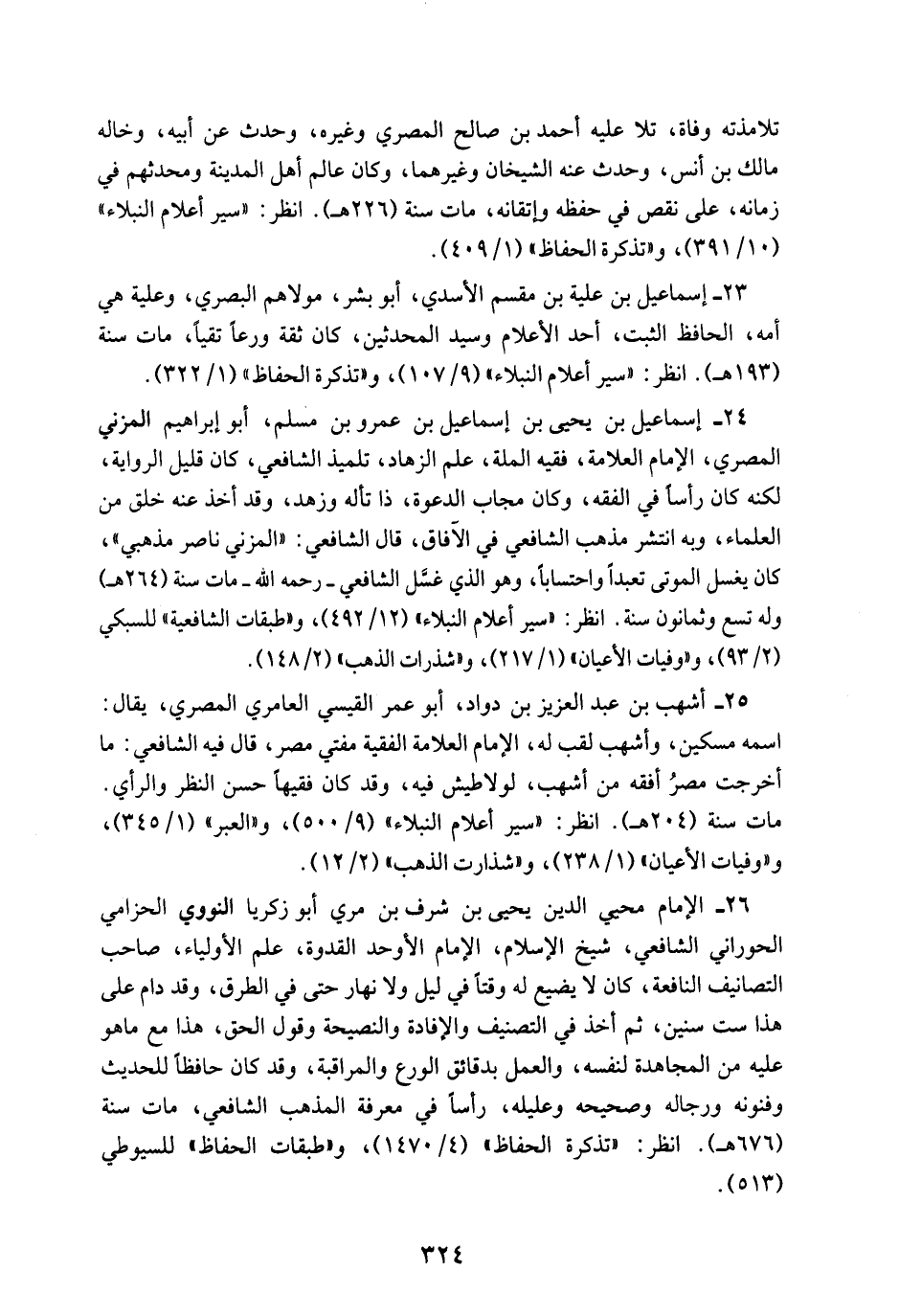 26 - الإمام محيي الدين يحيى بن شرف بن مري أبو زكريا النووي الحزامي الحوراني الشافعي، شيخ الإسلام، الإمام الأوحد القدوة، علم الأولياء، صاحب التصانيف النافعة، كان لا يضيع له وقتاً في ليل ولا نهار حتى في الطرق، وقد دام على هذا ست سنين، ثم أخذ في التصنيف والإفادة والنصيحة وقول الحق، هذا مع ما هو عليه من المجاهدة لنفسه، والعمل بدقائق الورع والمراقبة، وقد كان حافظاً للحديث وفنونه ورجاله وصحيحه وعليله، رأساً في معرفة المذهب الشافعي، مات سنة (676 هـ). انظر: "تذكرة الحفاظ" (4/ 1470)، و"طبقات الحفاظ" للسيوطي (513).