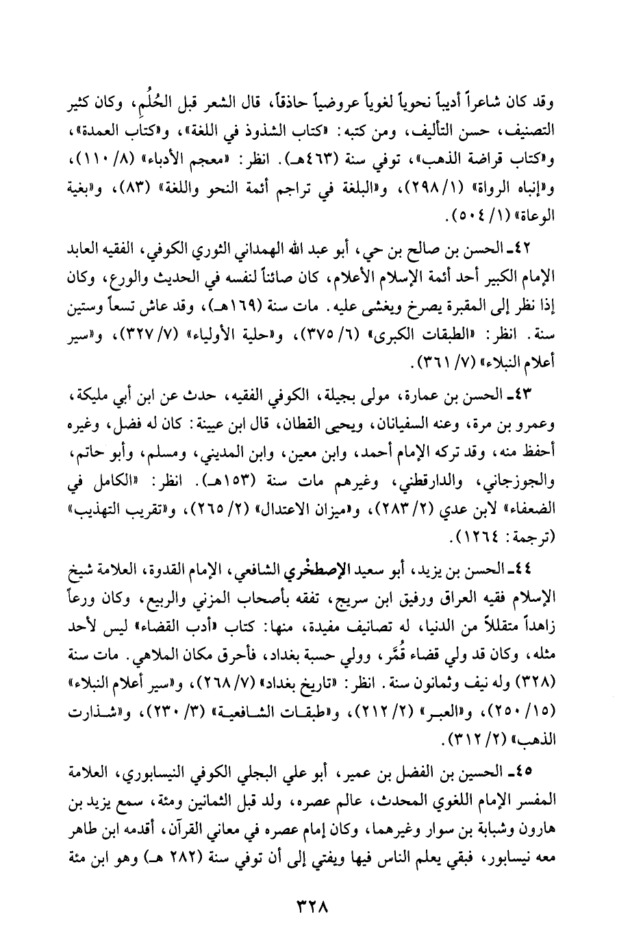 44 - الحسن بن يزيد، أبو سعيد الإصطخْري الشافعي، الإمام القدوة، العلامة شيخ الإسلام فقيه العراق ورفيق ابن سريج، تفقه بأصحاب المزني والربيع، وكان ورعاً زاهداً متقللاً من الدنيا، له تصانيف مفيدة، منها: كتاب "أدب القضاء" ليس لأحد مثله، وكان قد ولي قضاء قُمَّر، وولي حسبة بغداد، فأحرق مكان الملاهي. مات سنة (328) وله نيف وثمانون سنة. انظر: "تاريخ بغداد" (7/ 268)، و"سير أعلام النبلاء" (15/ 250)، و"العبر" (2/ 212)، و"طبقات الشافعية" (3/ 230)، و"شذارت الذهب" (2/ 312).