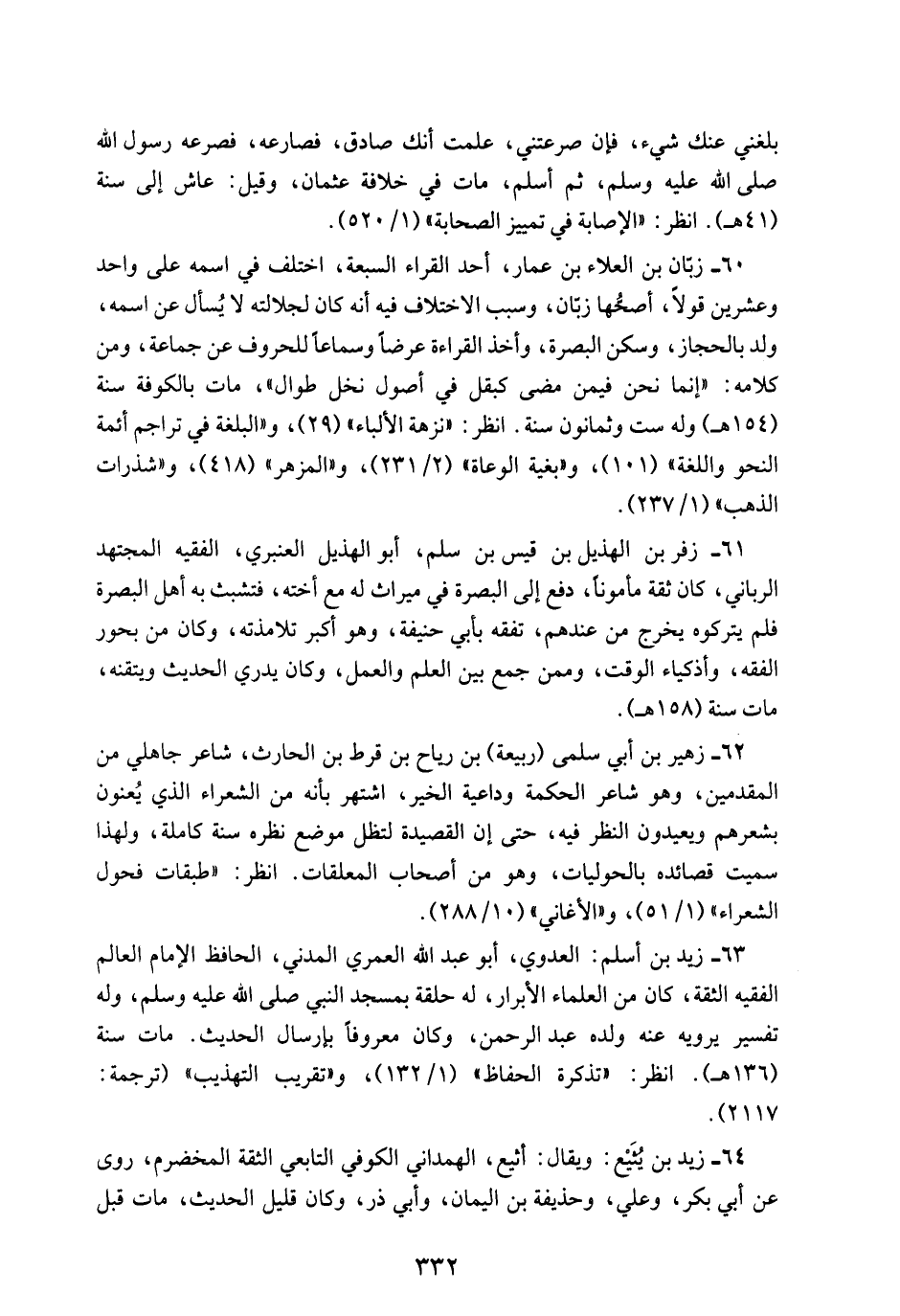 62 - زهير بن أبي سلمى (ربيعة) بن رياح بن قرط بن الحارث، شاعر جاهلي من المقدمين، وهو شاعر الحكمة وداعية الخير، اشتهر بأنه من الشعراء الذي يُعنون بشعرهم ويعيدون النظر فيه، حتى إن القصيدة لتظل موضع نظره سنة كاملة، ولهذا سميت قصائده بالحوليات، وهو من أصحاب المعلقات. انظر: "طبقات فحول الشعراء" (1/ 51)، و "الأغاني" (10/ 288).