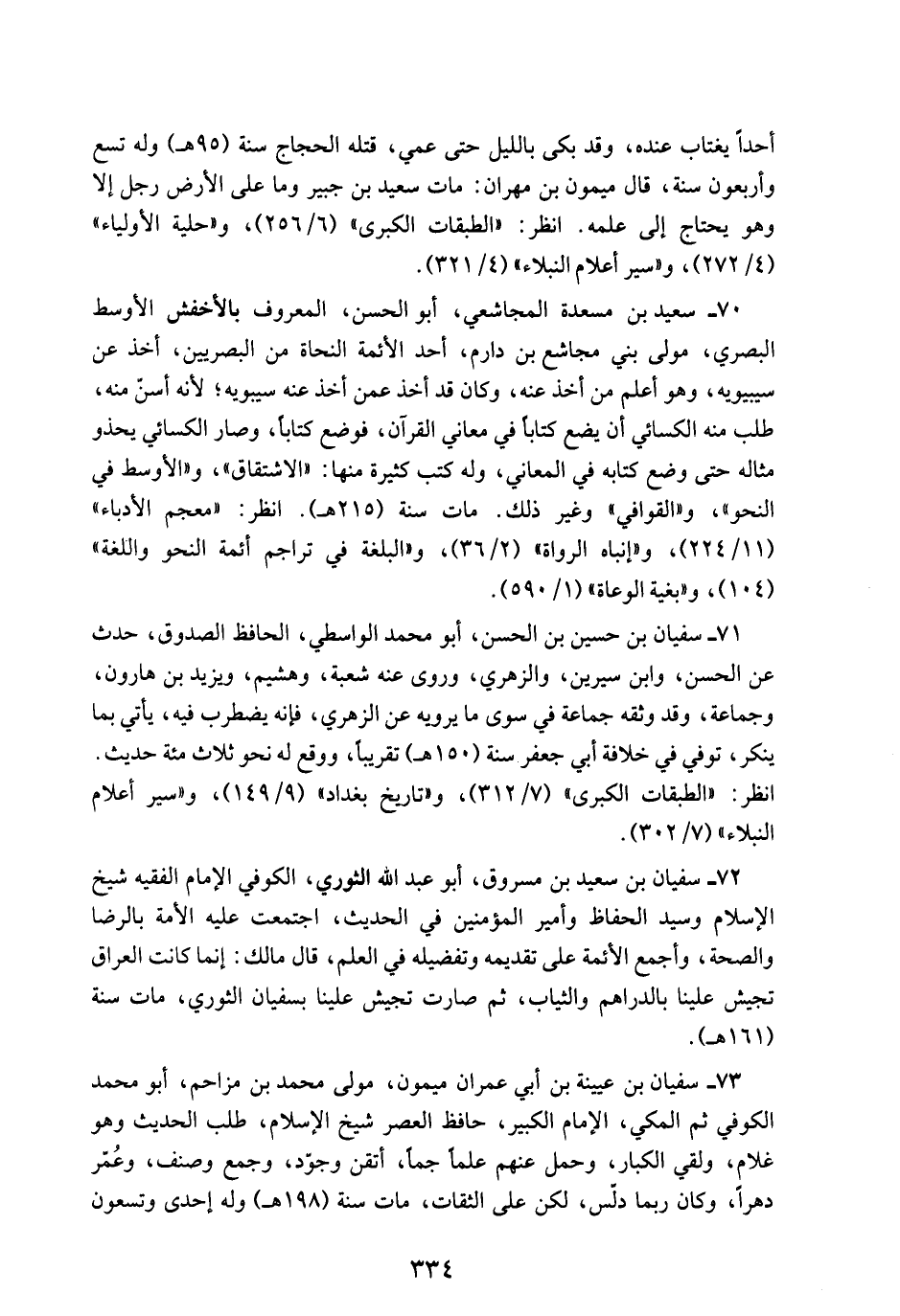 72 - سفيان بن سعيد بن مسروق، أبو عبد الله الثوري، الكوفي الإمام الفقيه شيخ الإسلام وسيد الحفاظ وأمير المؤمنين في الحديث، اجتمعت عليه الأمة بالرضا والصحة، وأجمع الأئمة على تقديمه وتفضيله في العلم، قال مالك: إنما كانت العراق تجيش علينا بالدراهم والثياب، ثم صارت تجيش علينا بسفيان الثوري، مات سنة (161 هـ).