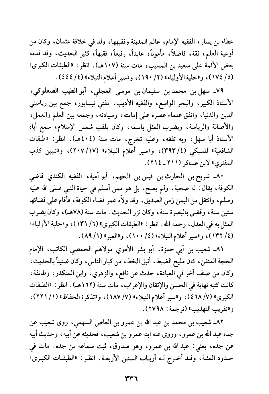81 - شعيب بن أبي حمزة، أبو بشر الأموي مولاهم الحمصي الكاتب، الإمام الحجة المتقن، كان مليح الضبط، أنيق الخط، من كبار الناس، وكان ضنيناً بالحديث، وكان من صنف آخر في العبادة، حدث عن نافع، والزهري، وابن المنكدر، وطائفة، كانت كتبه نهاية في الحسن والإتقان والإعراب، مات سنة (162 هـ). انظر: "الطبقات الكبرى" (7/ 468)، و"سير أعلام النبلاء" (7/ 187)، و"تذكرة الحفاظ" (1/ 221)، و"تقريب التهذيب" (ترجمة: 2798).