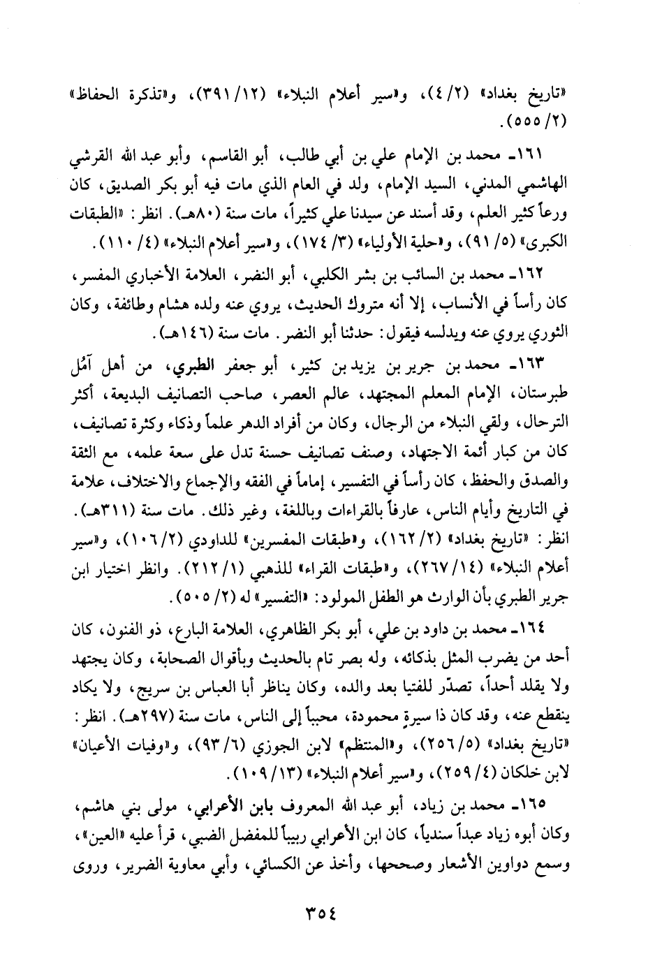 164 - محمد بن داود بن علي، أبو بكر الظاهري، العلامة البارع، ذو الفنون، كان أحد من يضرب المثل بذكائه، وله بصر تام بالحديث وبأقوال الصحابة، وكان يجتهد ولا يقلد أحداً، تصدّر للفتيا بعد والده، وكان يناظر أبا العباس بن سريج، ولا يكاد ينقطع عنه، وقد كان ذا سيرةٍ محمودة، محبباً إلى الناس، مات سنة (297 هـ). انظر: "تاريخ بغداد" (5/ 256)، و"المنتظم" لابن الجوزي (6/ 93)، و"وفيات الأعيان" لابن خلكان (4/ 259)، و"سير أعلام النبلاء" (13/ 109).