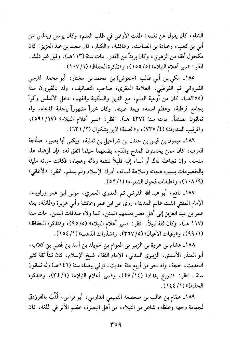 185 - مكي بن أبي طالب (حموش) بن محمد بن مختار، أبو محمد القيسي القيرواني ثم القرطبي، العلامة المقرئ صاحب التصانيف، ولد بالقيروان سنة (355 هـ)، كان من أوعية العلم، مع الدين والسكينة والفهم، دخل الأندلس وأقرأ بجامع قرطبة، وعظم اسمه، وبعد صيته، وكان خيراً مشهوراً بإجابة الدعاء، وله ثمانون مصنفاً. مات سنة (437 هـ). انظر: "سير أعلام النبلاء" (17/ 591)، و"ترتيب المدارك" (4/ 737)، و"الصلة" لابن بشكوال (2/ 631).