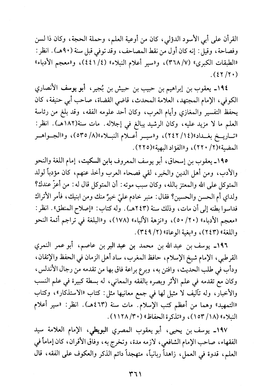 194 - يعقوب بن إبراهيم بن حبيب بن حبيش بن بُجير، أبو يوسف الأنصاري الكوفي، الإمام المجتهد، العلامة المحدث، قاضي القضاة، صاحب أبي حنيفة، كان يحفظ التفسير والمغازي وأيام العرب، وكان أحد علومه الفقه، وقد بلغ من رئاسة العلم ما لا مزيد عليه، وكان الرشيد يبالغ في إجلاله. مات سنة (182 هـ). انظر: "تاريخ بغداد" (14/ 242)، و"سير أعلام النبلاء" (8/ 535)، و"الجواهر المضية" (2/ 220)، و"الفؤاد البهية" (225).