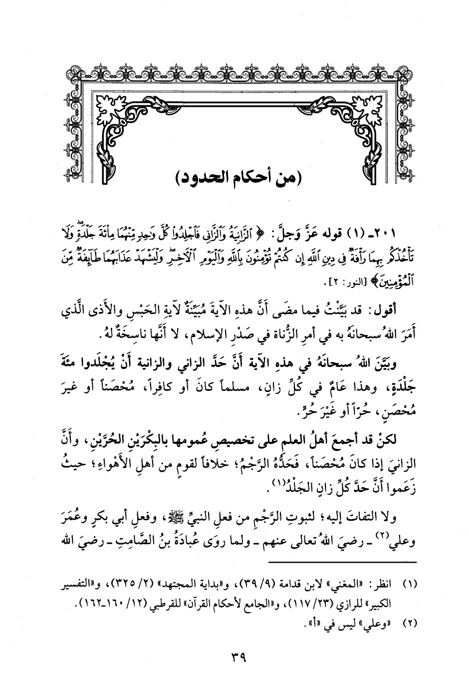 201 - (1) قوله عَزَّ وَجلَّ: {الزَّانِيَةُ وَالزَّانِي فَاجْلِدُوا كُلَّ وَاحِدٍ مِنْهُمَا مِائَةَ جَلْدَةٍ وَلَا تَأْخُذْكُمْ بِهِمَا رَأْفَةٌ فِي دِينِ اللَّهِ إِنْ كُنْتُمْ تُؤْمِنُونَ بِاللَّهِ وَالْيَوْمِ الْآخِرِ وَلْيَشْهَدْ عَذَابَهُمَا طَائِفَةٌ مِنَ الْمُؤْمِنِينَ} [النور: 2].