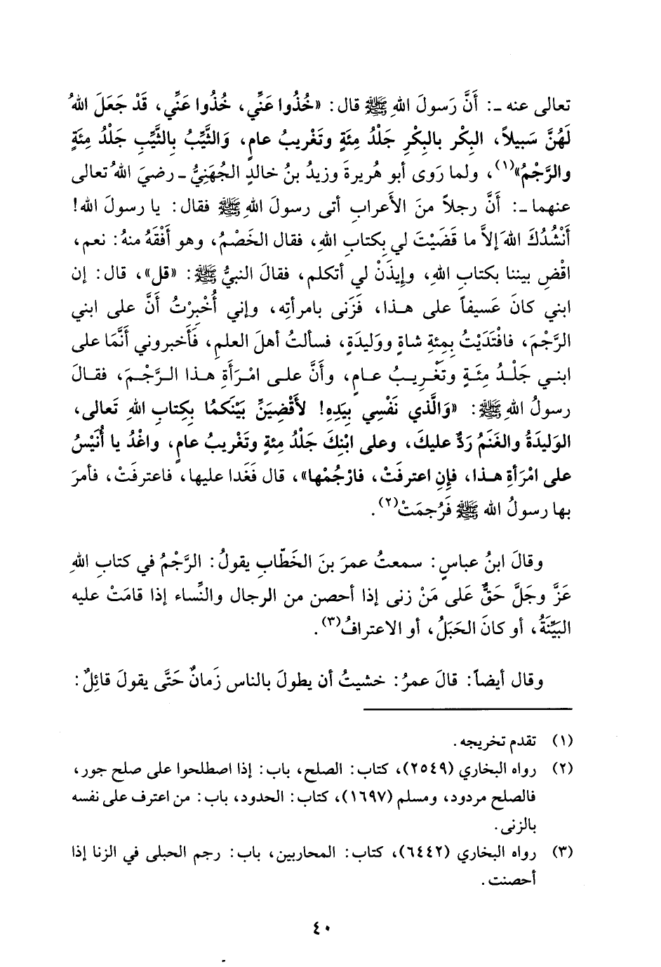 تعالى عنه-: أَنَّ رَسولَ اللهِ - صلى الله عليه وسلم - قال: "خُذُوا عَنِّي، خُذُوا عَنِّي، قَدْ جَعَلَ اللهُ لَهُنَّ سَبيلاً، البِكْر بالبِكْرِ جَلْدُ مِئَةٍ وتَغْريبُ عامٍ، وَالثَّيِّبُ بِالثيِّبِ جَلْدُ مِئَةٍ والرَّجْمُ" (¬1)، ولما رَوى أبو هُريرةَ وزيدُ بنُ خالدٍ الجُهَنِيُّ -رضيَ اللهُ تعالى عنهما-: أَنَّ رجلاً منَ الأَعرابِ أتى رسولَ اللهِ - صلى الله عليه وسلم - فقال: يا رسولَ الله! أَنْشُدُكَ اللهَ إلَّا ما قَضَيْتَ لي بِكتابِ اللهِ، فقال الخَصْمُ، وهو أَفْقَهُ منهُ: نعم، اقْضِ بيننا بكتابِ اللهِ، وإِيذَنْ لي أتكلم، فقالَ النبيُّ - صلى الله عليه وسلم -: "قل"، قال: إن ابني كانَ عَسيفاً على هذا، فَزَنى بامرأتِه، وإني أُخْبِرْتُ أَنَّ على ابني الرَّجْمَ، فافْتَدَيْتُ بِمِئةِ شاةٍ ووَليدَةٍ، فسألتُ أهلَ العلمِ، فَأَخبروني أَنَّمَا على ابني جَلْدُ مِئَةٍ وتغرِيبُ عامٍ، وأَنَّ على امْرَأَةِ هذا الرَّجْمَ، فقالَ رسولُ اللهِ -صلى الله عليه وسلم-: "وَالَّذي نَفْسِي بيَدِهِ! لأَقْضِيَنَّ بَيْنَكمُا بكِتابِ اللهِ تَعالى، الوَليدَةُ والغَنَمُ رَدٌّ عليكَ، وعلى ابنِكَ جَلْدُ مِئة وتَغْريبُ عَامٍ، واغْدُ يا أُنَيْسُ على امْرَأةِ هذا، فإِنِ اعترفَتْ، فارْجُمْها"، قال فَغَدا عليها، فاعترفَتْ، فأمرَ بها رسولُ الله - صلى الله عليه وسلم - فَرُجمَتْ (¬2).