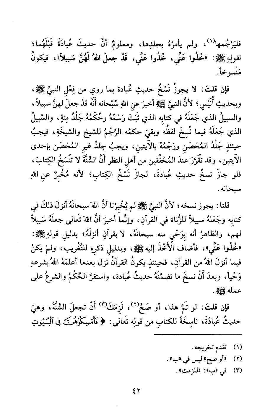 فإن قلتَ: لا يجوزُ نَسْخُ حديثِ عُبادة بما روي من فِعْلِ النبيِّ - صلى الله عليه وسلم -، وبحديثِ أُنَيْسٍ؛ لأنَّ النبيَّ - صلى الله عليه وسلم - أخبرَ عنِ اللهِ سُبْحانه أَنَّه قدْ جعلَ لهن سبيلاً، والسبَّيلُ الذي جَعَلَهُ في كتابِه الذي ثبَتَ رَسْمُهُ وحُكْمُهُ جَلْدُ مِئةٍ، والسَّبيلُ الذي جَعَلَهُ فيما نُسِخَ لفظُه وبقيَ حكمُه الرَّجْمُ للشيخ والشيخَةِ، فيجبُ حينئذِ جَلْدُ المُحْصَنِ ورَجْمُهُ بالآيتينِ، ويجبُ جلدُ غيرِ المُحْصَن بإحدى الآيتين، وقد تقرَّرَ عندَ المُحَقِّقين من أهلِ النظر أَن السُّنَةَ لا تنسَخُ الكِتابَ، فلو جازَ نسخُ حديثِ عُبادةَ، لجازَ نَسْخُ الكِتابِ؛ لأنه مُخْبِرٌ عنِ اللهِ سبحانه.