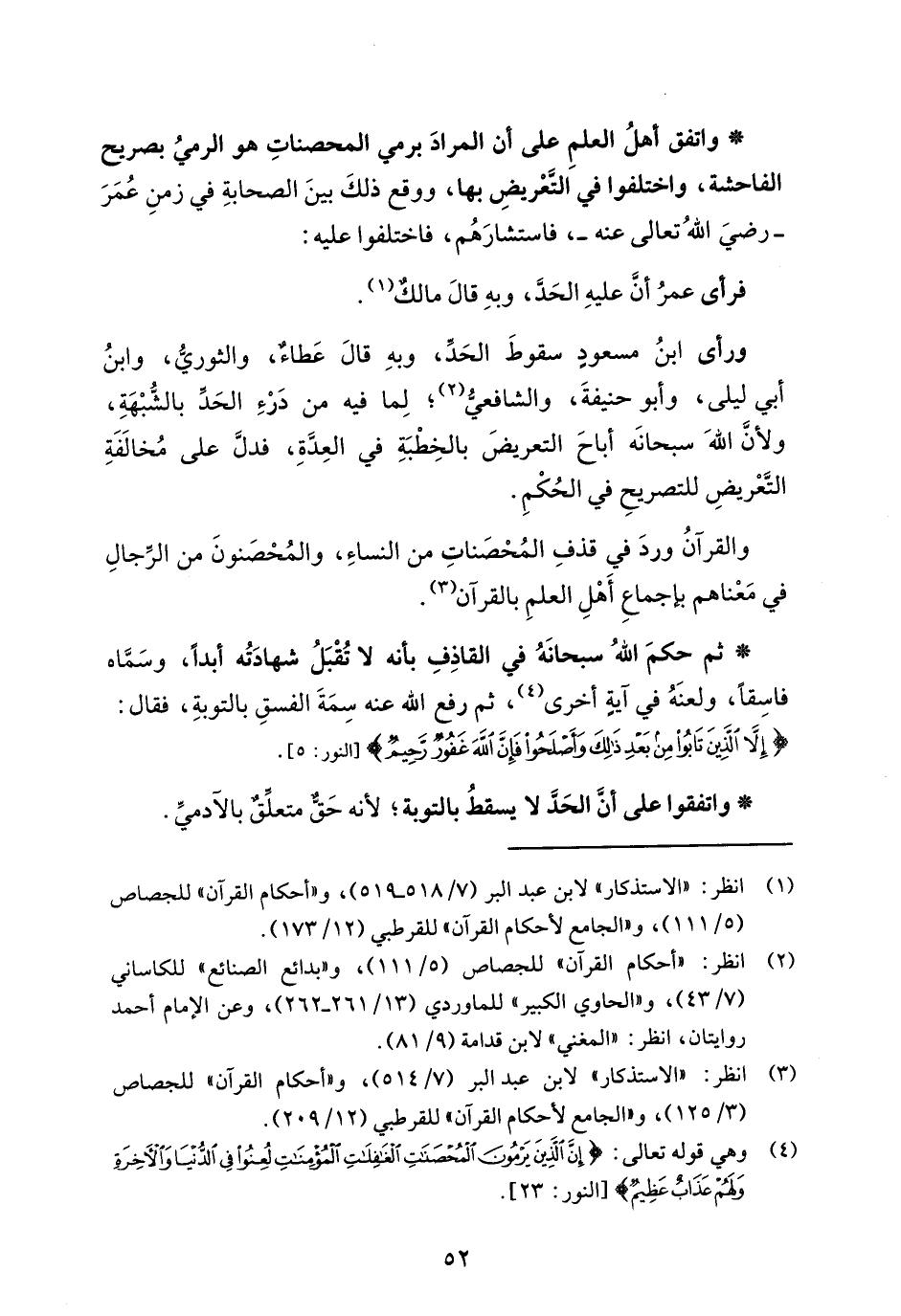 * واتفق أهلُ العلمِ على أن المرادَ برمي المحصناتِ هو الرميُ بصريح الفاحشة، واختلفوا في التَّعْريضِ بها، ووقع ذلكَ بينَ الصحابةِ في زمنِ عُمَرَ -رضيَ اللهُ تعالى عنه -، فاستشارَهُم، فاختلفوا عليه: فرأى عمرُ أنَّ عليهِ الحَدَّ، وبهِ قالَ مالكٌ (¬1).