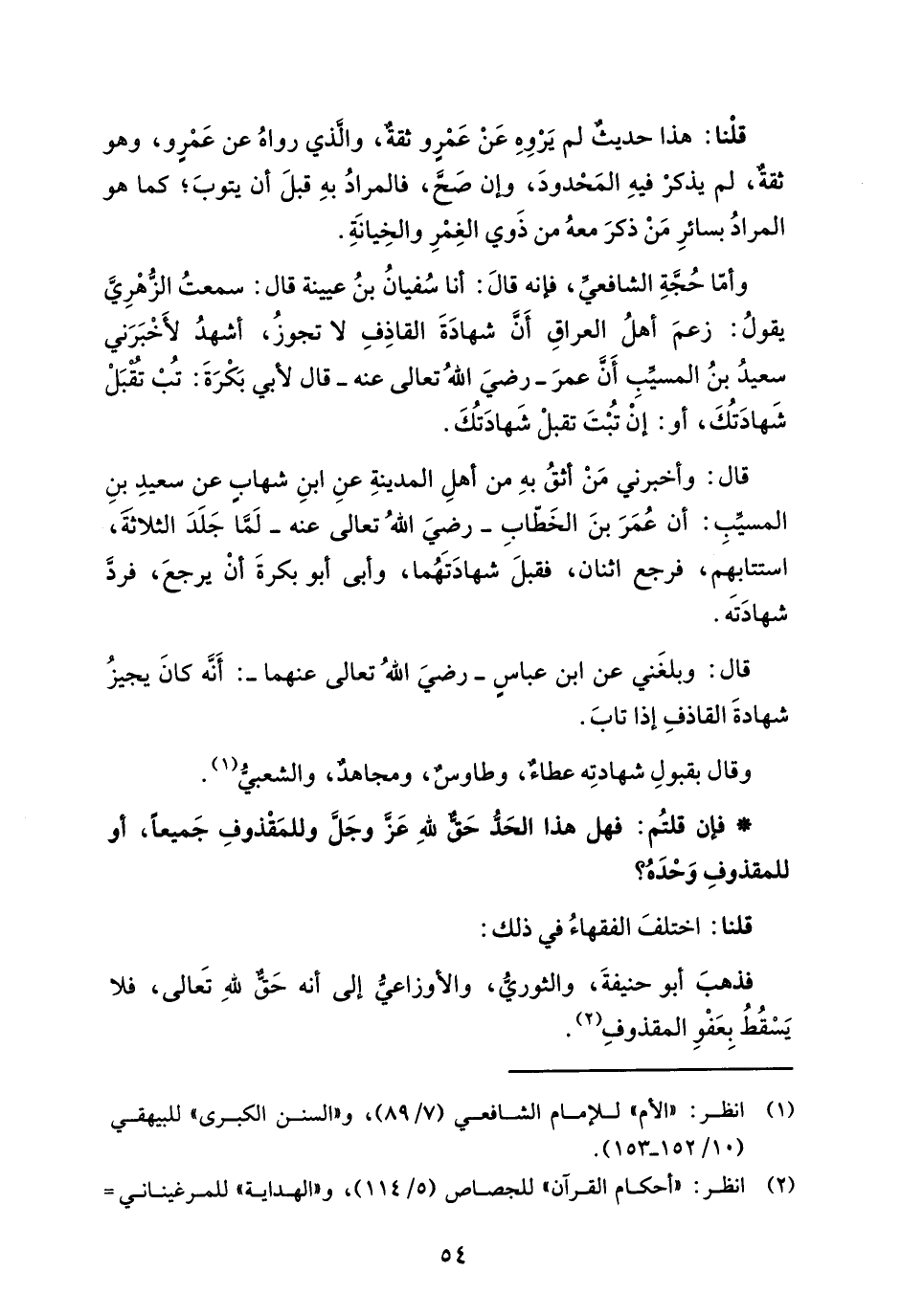 قال: وأخبرني مَنْ أثقُ بهِ من أهلِ المدينةِ عنِ ابنِ شهابِ عن سعيدِ بنِ المسيِّبِ: أن عُمَرَ بنَ الخَطّابِ -رضيَ اللهُ تعالى عنه - لَمَّا جَلَدَ الثلاثةَ، استتابهم، فرجع اثنان، فقبلَ شهادَتَهُما، وأبى أبو بكرةَ أنْ يرجعَ، فردَّ شهادَتَه.