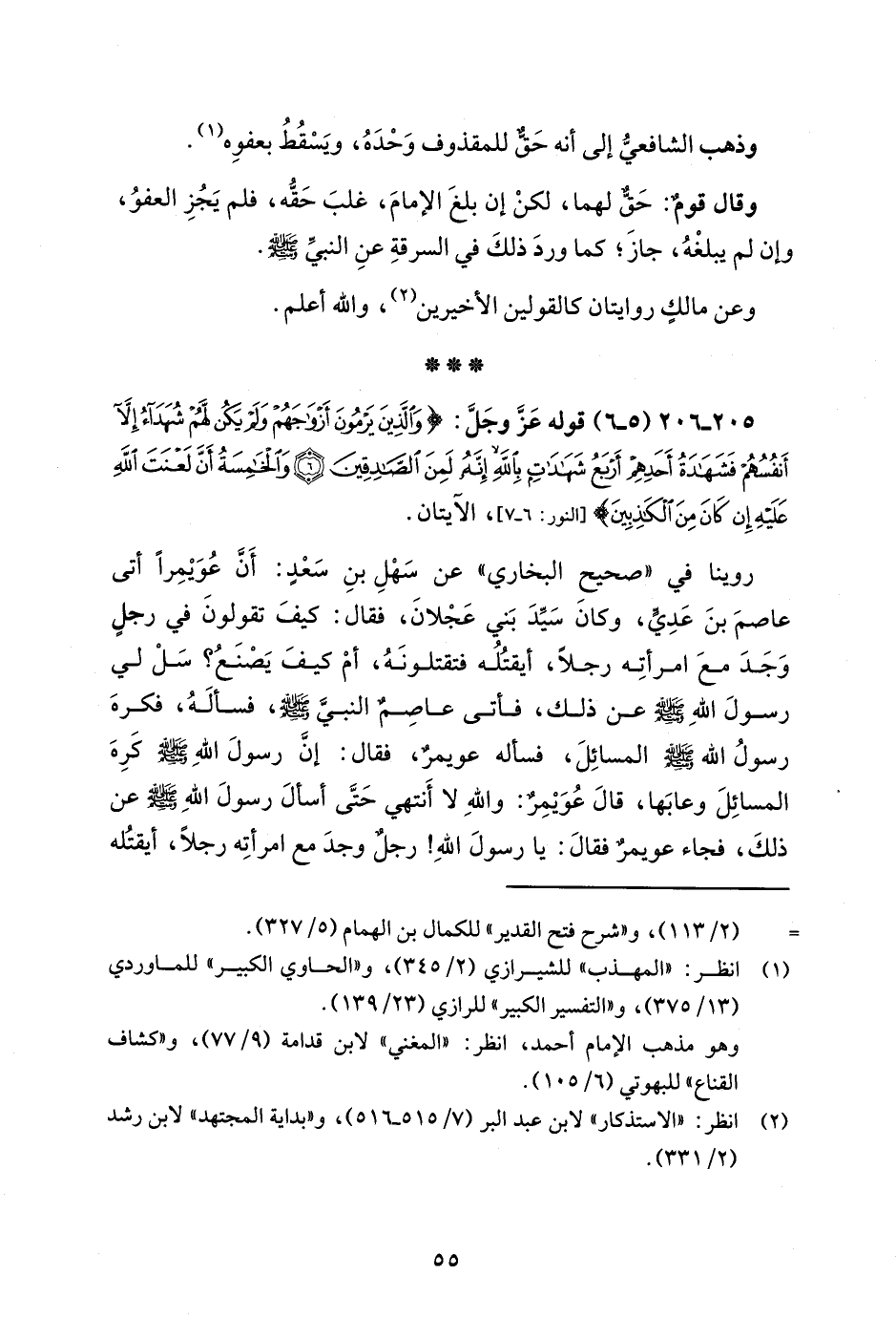 205 - 206 (5 - 6) قوله عَزَّ وجَلَّ: {وَالَّذِينَ يَرْمُونَ أَزْوَاجَهُمْ وَلَمْ يَكُنْ لَهُمْ شُهَدَاءُ إِلَّا أَنْفُسُهُمْ فَشَهَادَةُ أَحَدِهِمْ أَرْبَعُ شَهَادَاتٍ بِاللَّهِ إِنَّهُ لَمِنَ الصَّادِقِينَ (6) وَالْخَامِسَةُ أَنَّ لَعْنَتَ اللَّهِ عَلَيْهِ إِنْ كَانَ مِنَ الْكَاذِبِينَ} [النور: 6 - 7]، الآيتان.