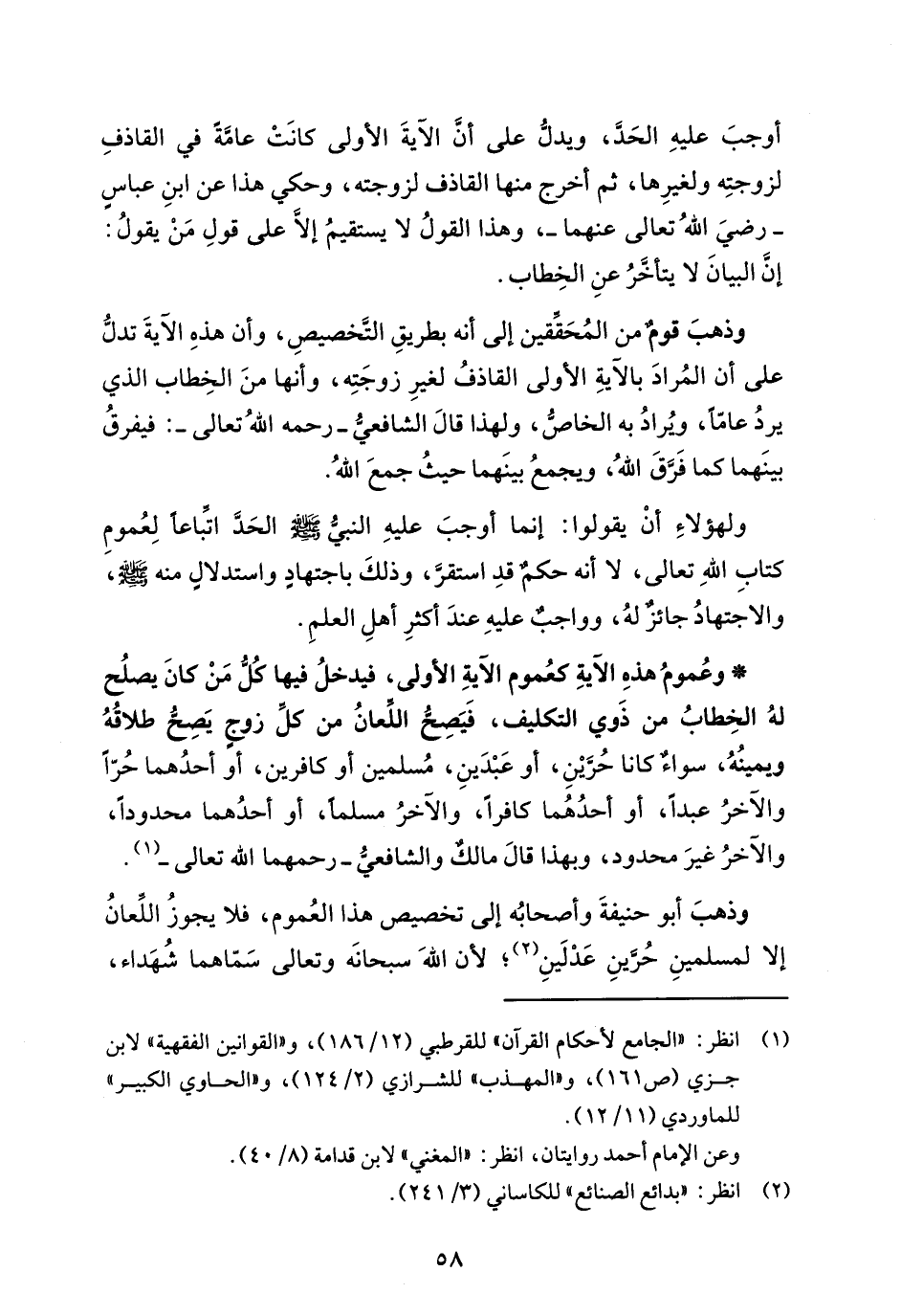 * وعُمومُ هذهٍ الآيةِ كعُموم الآيةِ الأولى، فيدخلُ فيها كُلُّ مَنْ كانَ يصلُح لهُ الخِطابُ من ذوي التكليف، فَيَصِحُّ اللِّعانُ من كل زوجٍ يَصِحُّ طلاقُهُ ويمينُهُ، سواءٌ كانا حُرَّيْنِ، أو عَبْدَينِ، مُسلمين أو كافرين، أو أحدُهما حُرًّا والآخرُ عبداً، أو أحدُهُما كافراً، والآخرُ مسلماً، أو أحدُهما محدوداً، والآخرُ غيرَ محدود، وبهذا قالَ مالكٌ والشافعيُّ -رحمهما الله تعالى - (¬1).