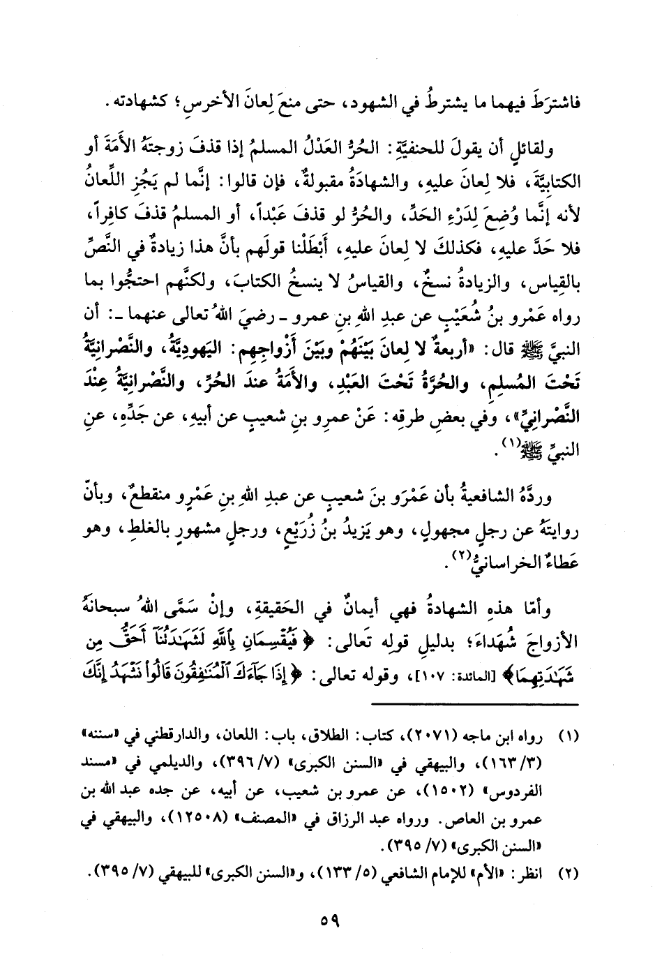 ولقائلِ أن يقولَ للحنفيَّةِ: الحُرُّ العَدْلُ المسلمُ إذا قذفَ زوجتَهُ الأَمَةَ أو الكتابِيَّةَ، فلا لِعانَ عليهِ، والشهادَةُ مقبولةٌ، فإن قالوا: إنَّما لم يَجُزِ اللِّعانُ لأنه إنَّما وُضِعَ لِدَرْءِ الحَدِّ، والحُرُّ لو قذفَ عَبْداً، أو المسلمُ قذفَ كافِراً، فلا حَدَّ عليهِ، فكذلكَ لا لِعانَ عليهِ، أَبْطَلْنا قولَهم بأنَّ هذا زيادةٌ في النَّصِّ بالقِياس، والزيادةُ نسخٌ، والقياسُ لا ينسخُ الكتابَ، ولكنَّهم احتجُّوا بما رواه عَمْرو بنُ شُعَيْبٍ عن عبدِ اللهِ بنِ عمرو -رضيَ اللهُ تعالى عنهما -: أن النبيَّ - صلى الله عليه وسلم - قال: "أربعةٌ لا لِعانَ بَيْنَهُمْ وبَيْنَ أَزْواجِهِم: اليَهودِيَّةُ، والنَّصْرانِيَّةُ تَحْتَ المُسلِمِ، والحُرَّةُ تَحْتَ العَبْدِ، والأَمَةُ عندَ الحُرِّ، والنَّصْرانِيَّةُ عِنْدَ النَّصْرانِيِّ"، وفي بعضِ طرقِه: عَنْ عمرِو بنِ شعيبٍ عن أبيهِ، عن جَدِّهِ، عنِ النبيِّ - صلى الله عليه وسلم - (¬1).