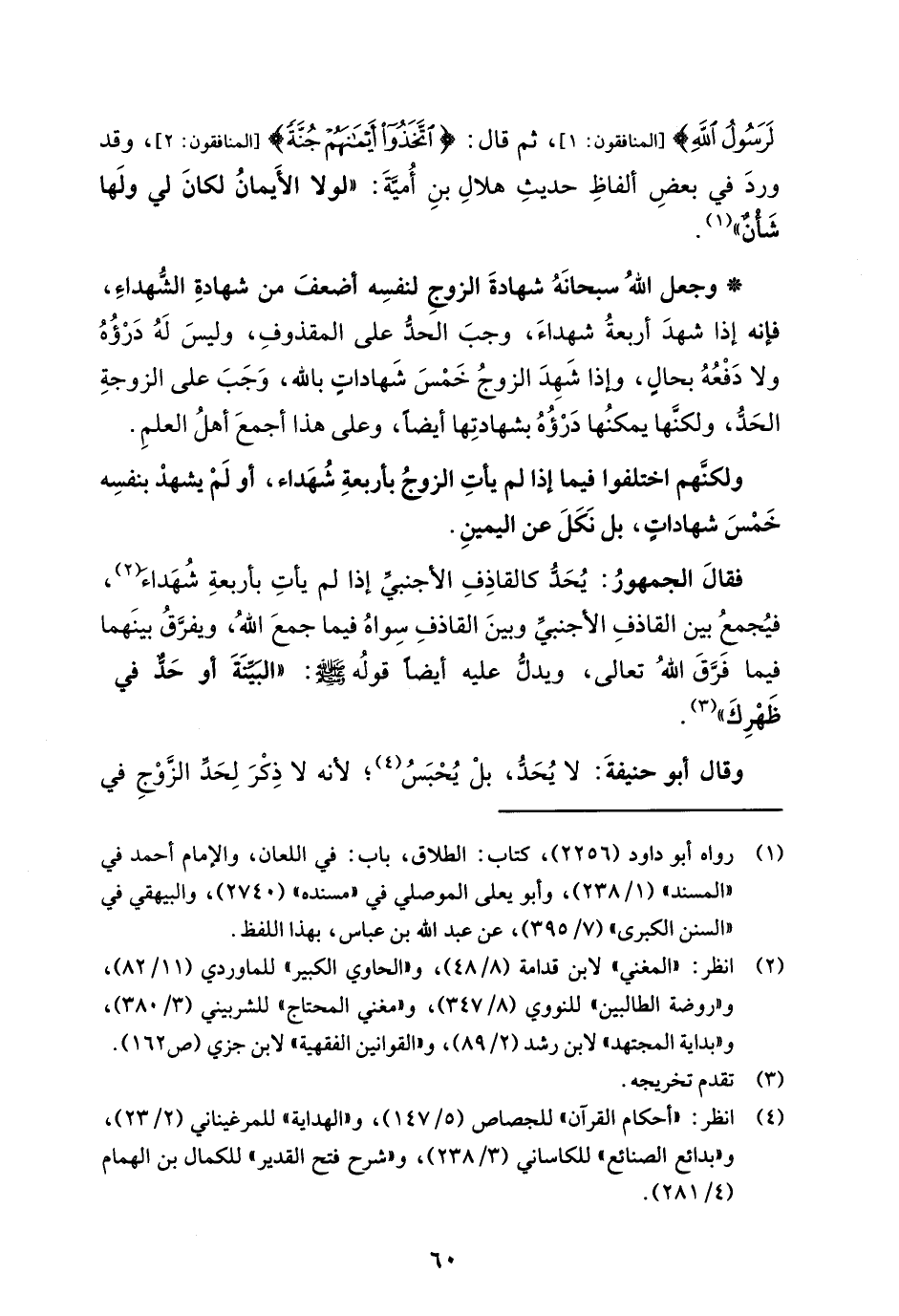 * وجعل اللهُ سبحانَهُ شهادةَ الزوجِ لنفسِه أضعفَ من شهادةِ الشُّهداءِ، فإنه إذا شهدَ أربعةُ شهداءَ, وجبَ الحدُّ على المقذوفِ، وليسَ لَهُ دَرْؤُهُ ولا دَفْعُهُ بحالٍ، وإذا شَهِدَ الزوجُ خَمْسَ شَهاداتٍ بالله، وَجَبَ على الزوجةِ الحَدُّ، ولكنَّها يمكنُها دَرْؤُهُ بشهادتِها أيضاً، وعلى هذا أجمعَ أهلُ العلمِ.