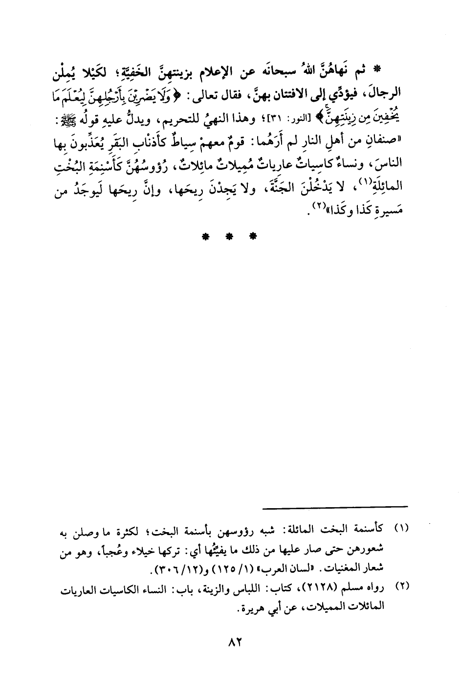 * ثم نَهاهُنَّ اللهُ سبحانَه عن الإعلام بزينتهِنَّ الخَفِيَّةِ؛ لكَيْلا يُمِلْن الرجالَ، فيؤدِّي إلى الافتتان بهنَّ، فقال تعالى: {وَلَا يَضْرِبْنَ بِأَرْجُلِهِنَّ لِيُعْلَمَ مَا يُخْفِينَ مِنْ زِينَتِهِنَّ} [النور: 31]؛ وهذا النهيُ للتحريم، ويدلُّ عليهِ قولُه - صلى الله عليه وسلم -: "صنفانِ من أهلِ النارِ لم أَرَهُما: قومٌ معهمْ سِياطٌ كأَذنْابِ البَقَرِ يُعَذِّبونَ بِها الناسَ، ونساءٌ كاسِيات عارِياتٌ مُمِيلاتٌ مائِلاتٌ، رُؤوسُهُنَّ كَأَسْنِمَةِ البُخْتِ المائِلَةِ (¬1)، لا يَدْخُلْنَ الجَنَّةَ، ولا يَجدْنَ رِيحَها، وإنَّ رِيحَها لَيوجَدُ من مَسيرةِ كَذا وكَذا" (¬2).