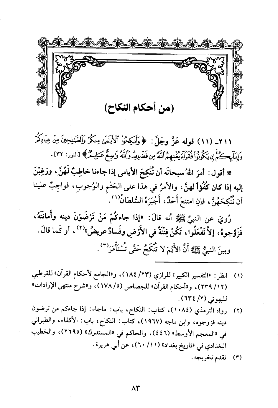 211 - (11) قوله عَزَّ وجَلَّ: {وَأَنْكِحُوا الْأَيَامَى مِنْكُمْ وَالصَّالِحِينَ مِنْ عِبَادِكُمْ وَإِمَائِكُمْ إِنْ يَكُونُوا فُقَرَاءَ يُغْنِهِمُ اللَّهُ مِنْ فَضْلِهِ وَاللَّهُ وَاسِعٌ عَلِيمٌ} [النور: 32].