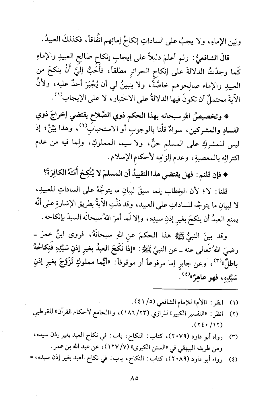 قالَ الشافعيُّ: ولم أعلمْ دليلاً على إيجابِ إنكاحِ صالحِ العبيدِ والإماءِ كَما وجدْتُ الدلالةَ على إنكاحِ الحرائرِ مطلقاً، فأَحَبُّ إليَّ أَنْ ينكحَ من العبيدِ والإماء صالِحوهم خاصَّةً، ولا يتبينُ لي أن يُجْبَرَ أحدٌ عليه، ولأنَّ الآيةَ محتملٌ أن تكونَ فيها الدلالةُ على الاختيار، لا على الإيجاب (¬1).