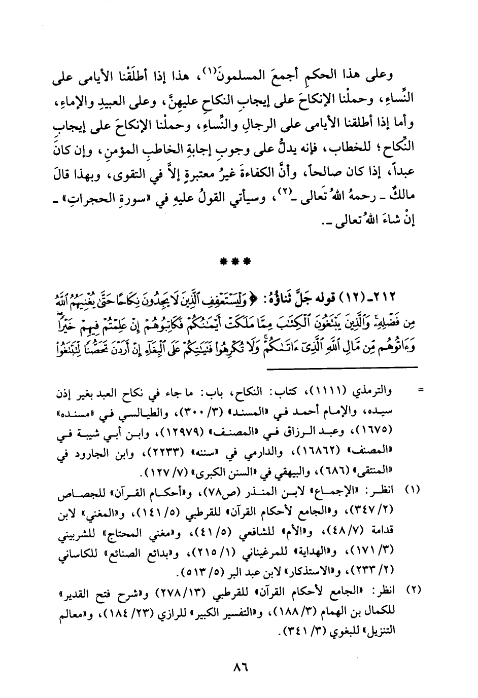 212 - (12) قوله جَلَّ ثَناؤُهُ: {وَلْيَسْتَعْفِفِ الَّذِينَ لَا يَجِدُونَ نِكَاحًا حَتَّى يُغْنِيَهُمُ اللَّهُ مِنْ فَضْلِهِ وَالَّذِينَ يَبْتَغُونَ الْكِتَابَ مِمَّا مَلَكَتْ أَيْمَانُكُمْ فَكَاتِبُوهُمْ إِنْ عَلِمْتُمْ فِيهِمْ خَيْرًا وَآتُوهُمْ مِنْ مَالِ اللَّهِ الَّذِي آتَاكُمْ وَلَا تُكْرِهُوا فَتَيَاتِكُمْ عَلَى الْبِغَاءِ إِنْ أَرَدْنَ تَحَصُّنًا لِتَبْتَغُوا