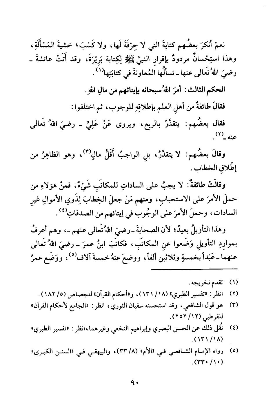 وقالَتْ طائفةٌ: لا يجبُ على الساداتِ للمكاتَبِ شَيْءٌ، فمنْ هؤلاءِ من حملَ الأمرَ على الاستحبابِ، ومنهم مَنْ جعلَ الخِطابَ لِذَوي الأموالِ غيرِ السادات، وحملَ الأمرَ على الوجُوب في إيتائهم من الصدقاتِ (¬4).