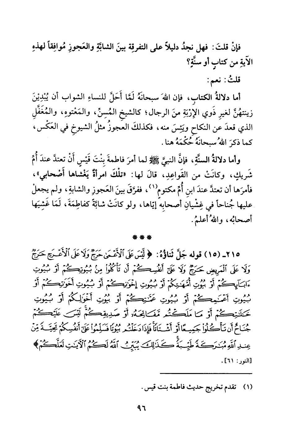 فإنْ قلتَ: فهل نجدُ دليلاً على التفرقِة بينَ الشابَّة والعَجوزِ مُوافِقاً لهذهِ الآيةِ من كتابٍ أو سنَّةٍ؟