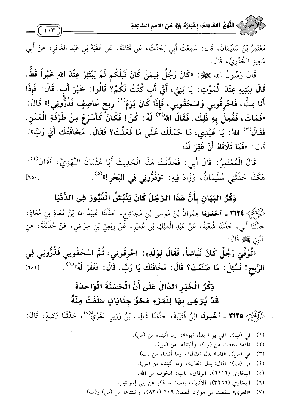 ٣١٢٤ - أَخبَرنا عِمْرَانُ بْنُ مُوسَى بْنِ مُجَاشِعٍ، حَدثنا عُبَيْدُ اللهِ بْنُ مُعَاذِ بْنِ مُعَاذٍ، حَدثنا أَبِي، حَدثنا شُعْبَةُ، عَنْ عَبْدِ الْمَلِكِ بْنِ عُمَيْرٍ، عَنْ رِبْعِيِّ بْنِ حِرَاشٍ، عَنْ حُذَيْفَةَ، عَنِ النَّبِيِّ صَلى الله عَلَيه وسَلم، قَالَ: "تُوُفِّيَ رَجُلٌ كَانَ نَبَّاشًا، فقَالَ لِوَلَدِهِ: احْرِقُونِي، ثُمَّ اسْحَقُونِي فَذُرُّونِي فِي الرِّيحِ، فَسُئِلَ: مَا صَنَعْتَ؟ قَالَ: مَخَافَتَكَ يَا رَبِّ، قَالَ: فَغَفَرَ لَهُ". [٦٥١]