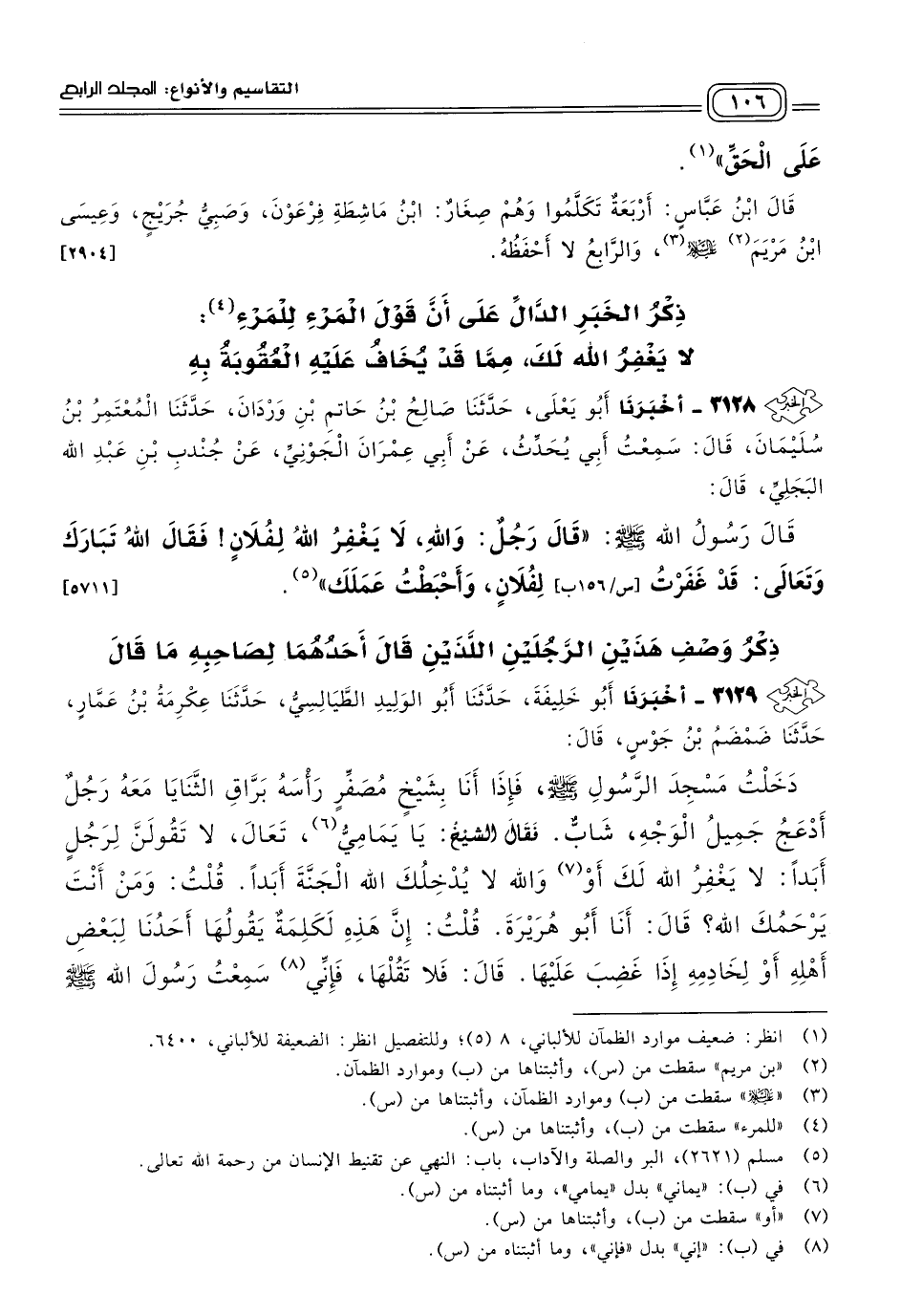 ٣١٢٨ - أَخبَرنا أَبُو يَعْلَى، حَدثنا صَالِحُ بْنُ حَاتِمِ بْنِ وَرْدَانَ، حَدثنا الْمُعْتَمِرُ بْنُ سُلَيْمَانَ، قَالَ: سَمِعْتُ أَبِيَ يُحَدِّثُ، عَنْ أَبِي عِمْرَانَ الْجَوْنِيِّ، عَنْ جُنْدُبِ بْنِ عَبْدِ اللهِ الْبَجَلِيِّ، قَالَ: قَالَ رَسُولُ اللهِ صَلى الله عَلَيه وسَلم: "قَالَ رَجُلٌ: وَاللهِ لَا يَغْفِرُ اللهُ لِفُلَانٍ، فَقَالَ اللهُ تَبَارَكَ وَتَعَالَى: قَدْ غَفَرْتُ لِفُلَانٍ، وَأَحْبَطْتُ عَمَلَكَ". [٥٧١١]