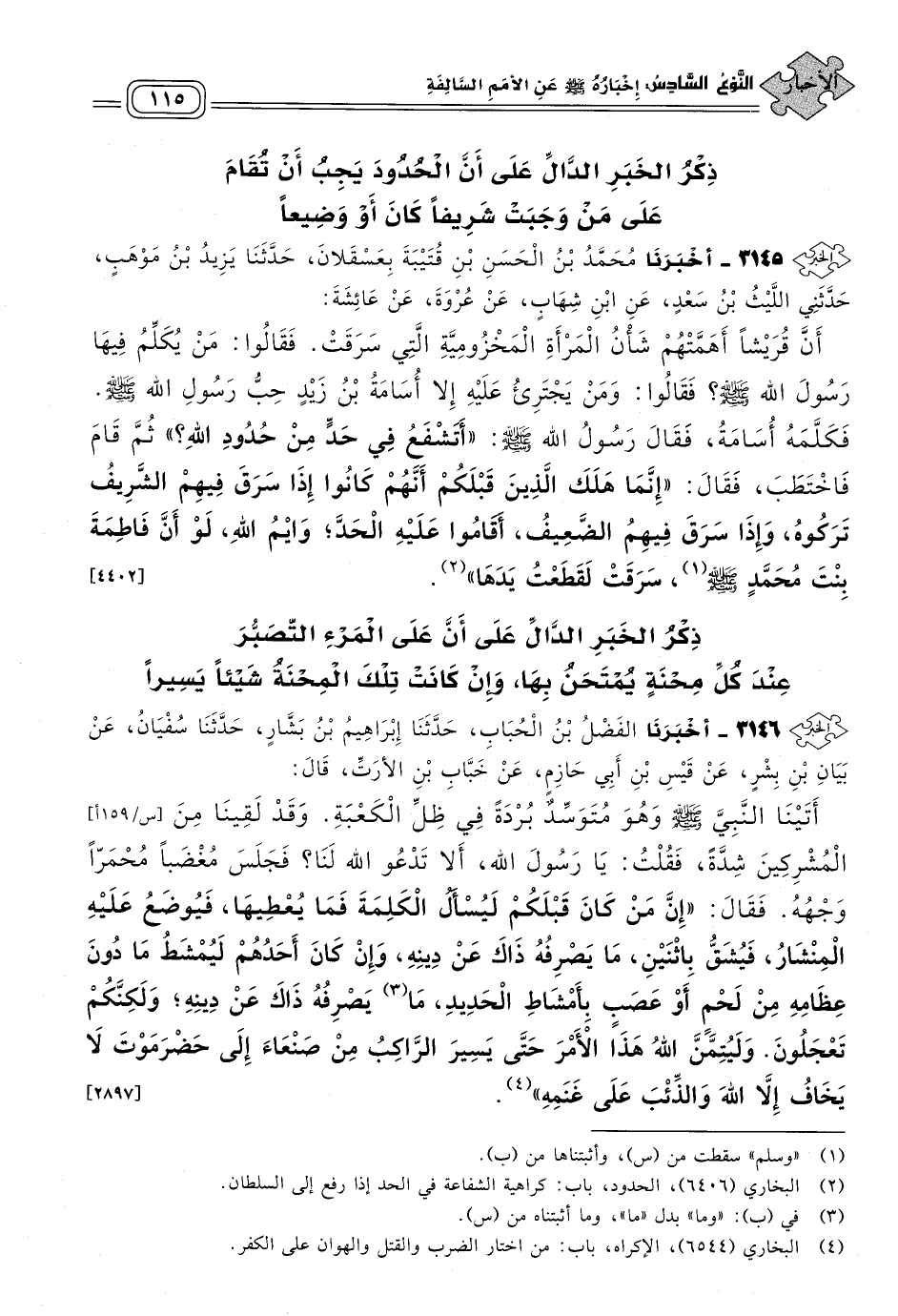 ٣١٤٥ - أَخبَرنا مُحَمَّدُ بْنُ الْحَسَنِ بْنِ قُتَيْبَةَ، بِعَسْقَلَانَ، حَدثنا يَزِيدُ بْنُ مَوْهَبٍ، حَدَّثَنِي اللَّيْثُ بْنُ سَعْدٍ، عَنِ ابْنِ شِهَابٍ، عَنْ عُرْوَةَ، عَنْ عَائِشَةَ، أَنَّ قُرَيْشًا أَهَمَّتْهُمْ شَأْنُ الْمَرْأَةِ الْمَخْزُومِيَّةِ الَّتِي سَرَقَتْ، فَقَالُوا: مَنْ يُكَلِّمُ فِيهَا رَسُولَ اللهِ صَلى الله عَلَيه وسَلم؟ فَقَالُوا: وَمَنْ يَجْتَرِئُ عَلَيْهِ إِلَاّ أُسَامَةُ بْنُ زَيْدٍ، حِبُّ رَسُولِ اللهِ صَلى الله عَلَيه وسَلم، فَكَلَّمَهُ أُسَامَةُ، فَقَالَ رَسُولُ اللهِ صَلى الله عَلَيه وسَلم: "أَتَشْفَعُ فِي حَدٍّ مِنْ حُدُودِ اللهِ؟ " ثُمَّ قَامَ فَاخْتَطَبَ، فَقَالَ: "إِنَّمَا هَلَكَ الَّذِينَ قَبْلَكُمْ أَنَّهُمْ كَانُوا إِذَا سَرَقَ فِيهِمُ الشَّرِيفُ تَرَكُوهُ، وَإِذَا سَرَقَ فِيهِمُ الضَّعِيفُ أَقَامُوا عَلَيْهِ الْحَدَّ، وَايْمُ اللهِ، لَوْ أَنَّ فَاطِمَةَ بِنْتَ مُحَمَّدٍ صَلى الله عَلَيه وسَلم سَرَقَتْ لَقَطَعْتُ يَدَهَا". [٤٤٠٢]