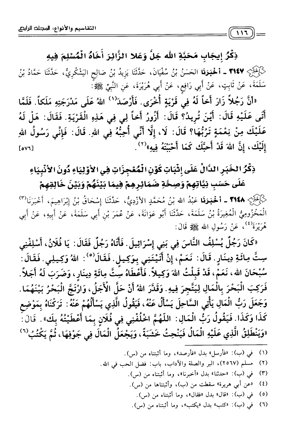 ٣١٤٧ - أَخبَرنا الْحَسَنُ بْنُ سُفْيَانَ، حَدثنا يَزِيدُ بْنُ صَالِحٍ الْيَشْكُرِيُّ، حَدثنا حَمَّادُ بْنُ سَلَمَةَ، عَنْ ثَابِتٍ، عَنْ أَبِي رَافِعٍ، عَنْ أَبِي هُرَيْرَةَ، عَنِ النَّبِيِّ صَلى الله عَلَيه وسَلم؛ "أَنَّ رَجُلاً زَارَ أَخًا لَهُ فِي قَرْيَةٍ أُخْرَى، فَأَرْصَدَ اللهُ عَلَى مَدْرَجَتِهِ مَلَكًا، فَلَمَّا أَتَى عَلَيْهِ، قَالَ: أَيْنَ تُرِيدُ؟ قَالَ: أَزُورُ أَخًا لِي فِي هَذِهِ الْقَرْيَةِ، فقَالَ: هَلْ لَهُ عَلَيْكَ مِنْ نِعْمَةٍ تَرُبُّهَا؟ قَالَ: لَا، إِلَاّ أَنِّي أُحِبُّهُ فِي اللهِ، قَالَ: فَإِنِّي رَسُولُ اللهِ إِلَيْكَ، إِنَّ اللهَ قَدْ أَحَبَّكَ كَمَا أَحْبَبْتَهُ فِيهِ". [٥٧٦]