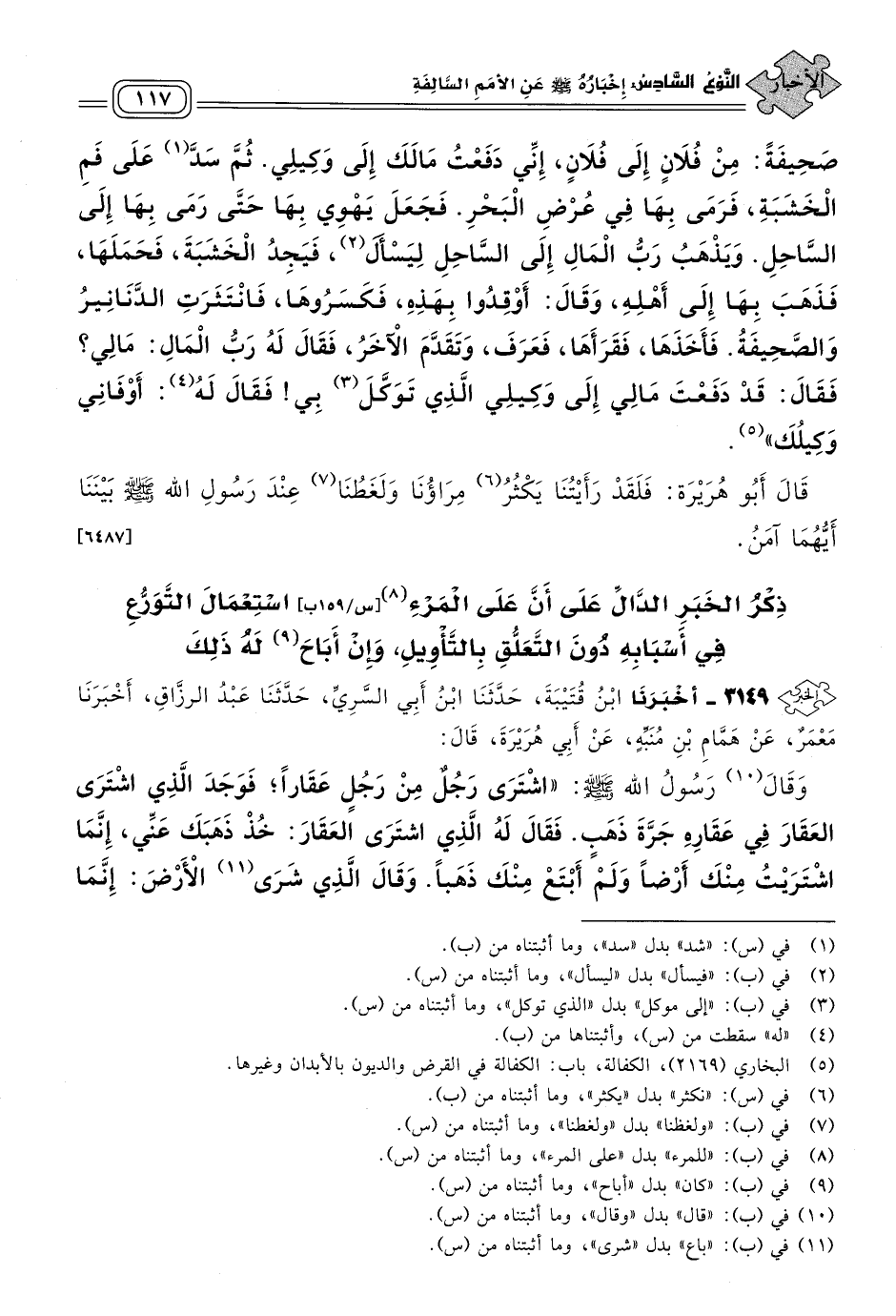 فَيَقُولُ رَبُّ الْمَالِ: اللهُمَّ اخْلُفْنِي فِي فُلَانٍ بِمَا أَعْطَيْتُهُ بِكَ"، قَالَ: "وَيَنْطَلِقُ الَّذِي عَلَيْهِ الْمَالُ، فَيَنْحِتُ خَشَبَةً، وَيَجْعَلُ الْمَالَ فِي جَوْفِهَا، ثُمَّ يَكْتُبُ صَحِيفَةً: مِنْ فُلَانٍ إِلَى فُلَانٍ، إِنِّي دَفَعْتُ مَالَكَ إِلَى وَكِيلِي، ثُمَّ سَدَّ عَلَى فَمِ الْخَشَبَةِ، فَرَمَى بِهَا فِي عُرْضِ الْبَحْرِ، فَجَعَلَ يَهْوِي بِهَا حَتَّى رَمَى بِهَا إِلَى السَّاحِلِ، وَيَذْهَبُ رَبُّ الْمَالِ إِلَى السَّاحِلِ لِيَسْأَلَ، فَيَجِدُ الْخَشَبَةَ، فَحَمَلَهَا، فَذَهَبَ بِهَا إِلَى أَهْلِهِ، وَقَالَ: أَوْقِدُوا بِهَذِهِ، فَكَسَرُوهَا، فَانْتَثَرَتِ الدَّنَانِيرُ، وَالصَّحِيفَةُ، فَأَخَذَهَا، فَقَرَأَهَا، فَعَرَفَ، وَتَقَدَّمَ الآخَرُ، فَقَالَ لَهُ رَبُّ الْمَالِ: مَالِي؟ فَقَالَ: قَدْ دَفَعْتُ مَالِي إِلَى وَكِيلِي الذي تَوَكَّلٍ بِي، فَقَالَ لَهُ: أَوْفَانِي وَكِيلُكَ".