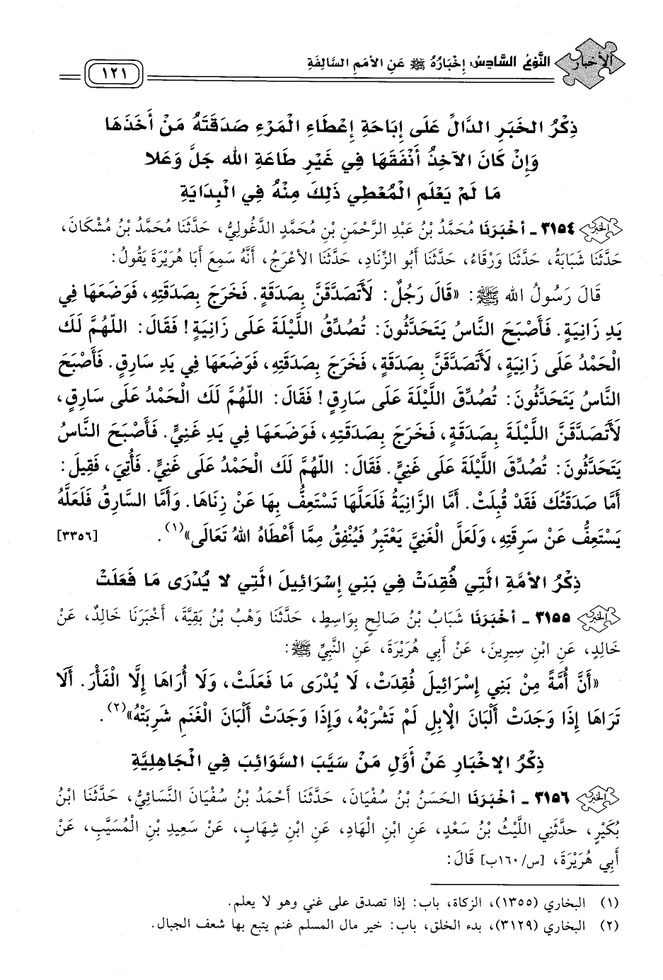 ٣١٥٤ - أَخبَرنا مُحَمَّدُ بْنُ عَبْدِ الرَّحْمَنِ بْنِ مُحَمَّدٍ الدَّغُولِيُّ، حَدثنا مُحَمَّدُ بْنُ مُشْكَانَ، حَدثنا شَبَابَةُ، حَدثنا وَرْقَاءُ، حَدثنا أَبُو الزِّنَادِ، حَدثنا الأَعْرَجُ، أَنَّهُ سَمِعَ أَبَا هُرَيْرَةَ، يَقُولُ: قَالَ رَسُولُ اللهِ صَلى الله عَلَيه وسَلم: "قَالَ رَجُلٌ: لأَتَصَدَّقَنَّ بِصَدَقَةٍ، فَخَرَجَ بِصَدَقَتِهِ فَوَضَعَهَا فِي يَدِ زَانِيَةٍ، فَأَصْبَحَ النَّاسُ يَتَحَدَّثُونَ: تُصُدِّقَ اللَّيْلَةَ عَلَى زَانِيَةٍ، فَقَالَ: اللهُمَّ لَكَ الْحَمْدُ عَلَى زَانِيَةٍ، لأَتَصَدَّقَنَّ بِصَدَقَةٍ، فَخَرَجَ بِصَدَقَتِهِ فَوَضَعَهَا فِي يَدِ سَارِقٍ، فَأَصْبَحَ النَّاسُ يَتَحَدَّثُونَ: تُصُدِّقَ اللَّيْلَةَ عَلَى سَارِقٍ، فَقَالَ: اللهُمَّ لَكَ الْحَمْدُ عَلَى سَارِقٍ، لأَتَصَدَّقَنَّ اللَّيْلَةَ بِصَدَقَةٍ، فَخَرَجَ بِصَدَقَتِهِ فَوَضَعَهَا فِي يَدِ غَنِيٍّ، فَأَصْبَحَ النَّاسُ يَتَحَدَّثُونَ: تُصُدِّقَ اللَّيْلَةَ عَلَى غَنِيٍّ، فَقَالَ: اللهُمَّ لَكَ الْحَمْدُ عَلَى غَنِيٍّ، فَأُتِيَ، فَقِيلَ: أَمَّا صَدَقَتُكَ فَقَدْ قُبِلَتْ، أَمَّا الزَّانِيَةُ فَلَعَلَّهَا تَسْتَعِفُّ بِهَا عَنْ زِنَاهَا، وَأَمَّا السَّارِقُ فَلَعَلَّهُ يَسْتَعِفُّ عَنْ سَرِقَتِهِ، وَلَعَلَّ الْغَنِيَّ يَعْتَبِرُ فَيُنْفِقُ مِمَّا أَعْطَاهُ اللهُ تَعَالَى". [٣٣٥٦]
