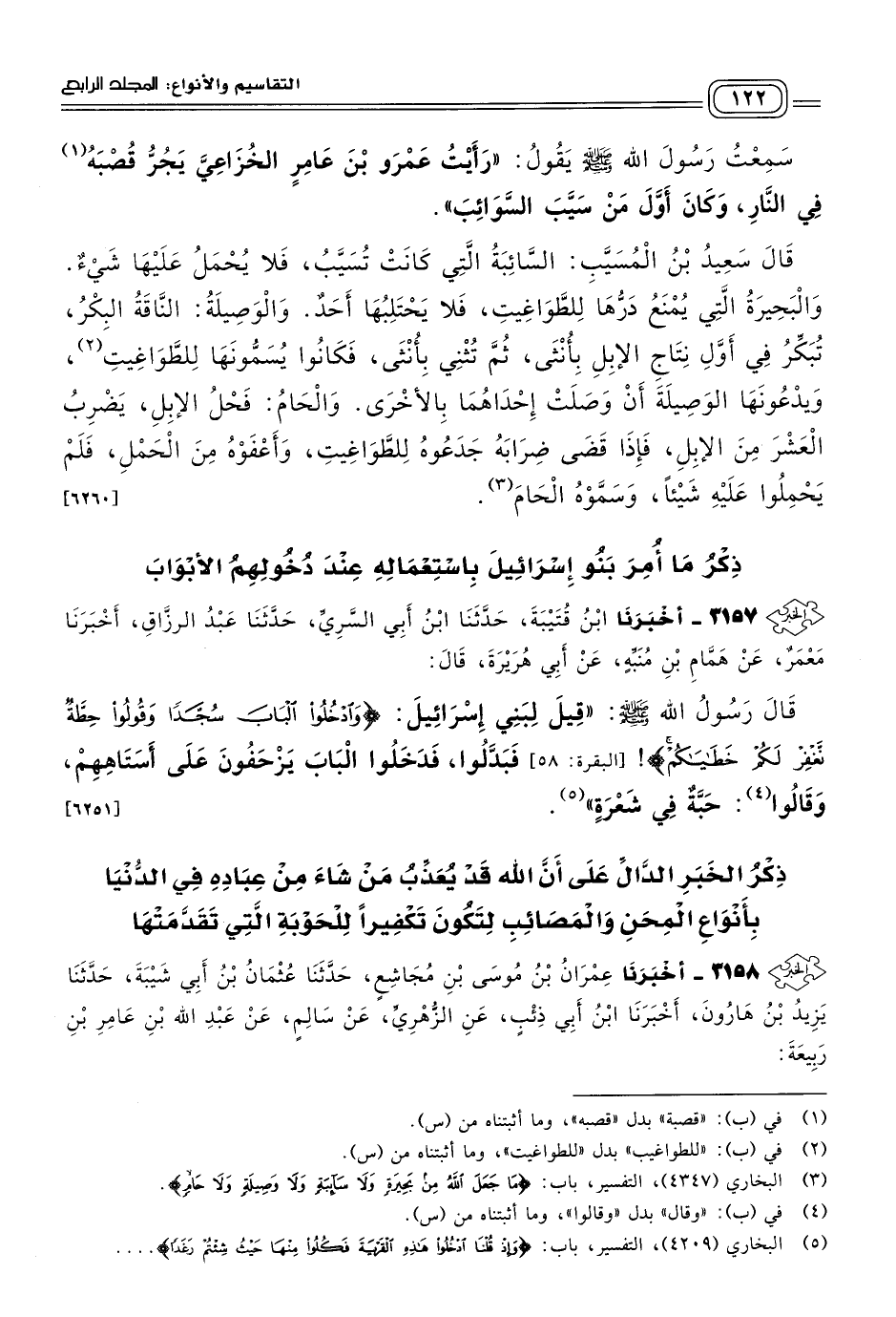 ٣١٥٧ - أَخبَرنا ابْنُ قُتَيْبَةَ، حَدثنا ابْنُ أَبِي السَّرِيِّ، حَدثنا عَبْدُ الرَّزَّاقِ، أَخبَرنا مَعْمَرٌ، عَنْ هَمَّامِ بْنِ مُنَبِّهٍ، عَنْ أَبِي هُرَيْرَةَ، قَالَ: قَالَ رَسُولُ اللهِ صَلى الله عَلَيه وسَلم: "قِيلَ لِبَنِي إِسْرَائِيلَ: {وَادْخُلُوا الْبَابَ سُجَّدًا وَقُولُوا حِطَّةٌ نَغْفِرْ لَكُمْ خَطَايَاكُمْ} [البقرة: ٥٨] فَبَدَّلُوا فَدَخَلُوا الْبَابَ يَزْحَفُونَ عَلَى أَسْتَاهِهِمْ، وَقَالُوا: حَبَّةٌ فِي شَعْرَةٍ". [٦٢٥١]