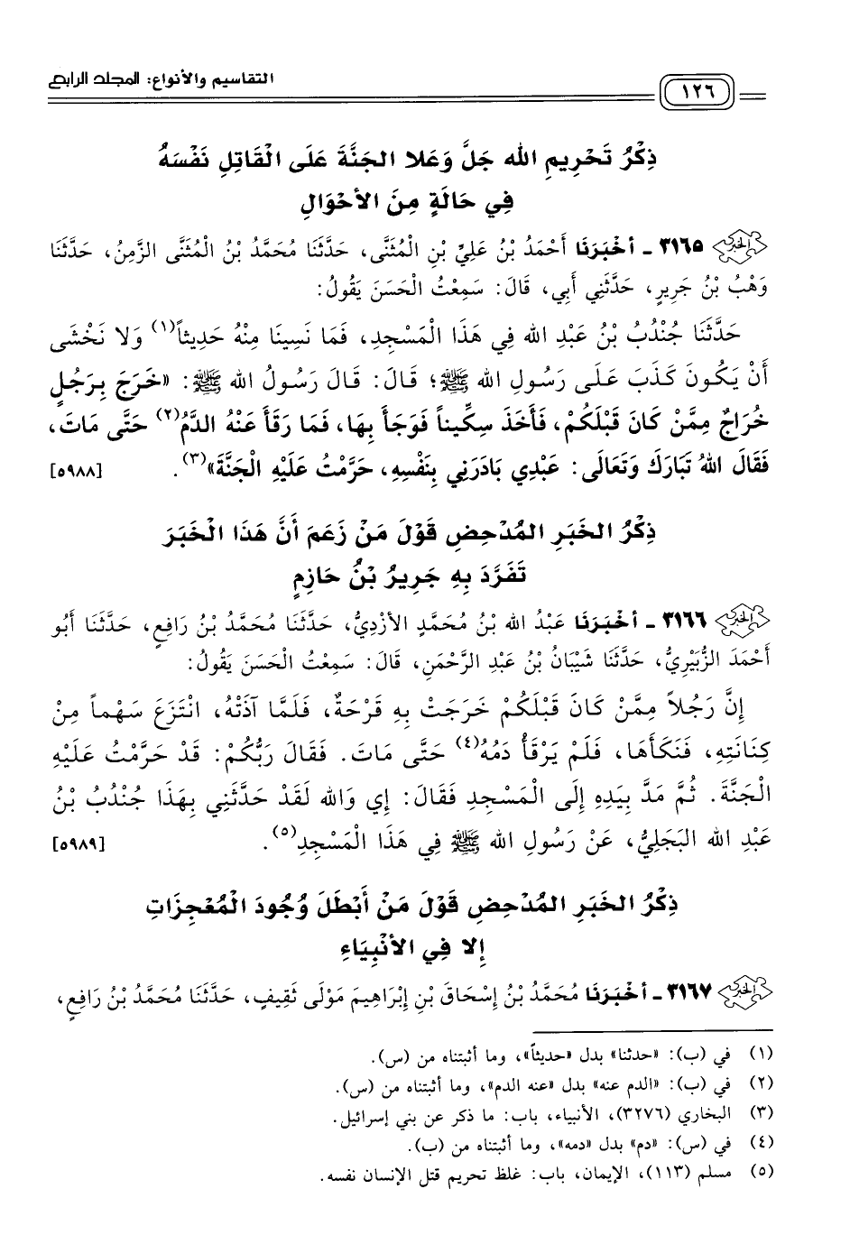 ٣١٦٦ - أَخبَرنا عَبْدُ اللهِ بْنُ مُحَمَّدٍ الأَزْدِيُّ، حَدثنا مُحَمَّدُ بْنُ رَافِعٍ، حَدثنا أَبُو أَحْمَدَ الزُّبَيْرِيُّ، حَدثنا شَيْبَانُ بْنُ عَبْدِ الرَّحْمَنِ، قَالَ: سَمِعْتُ الْحَسَنَ، يَقُولُ: إِنَّ رَجُلاً مِمَّنْ كَانَ قَبْلَكُمْ خَرَجَتْ بِهِ قُرْحَةٌ، فَلَمَّا آذَتْهُ انْتَزَعَ سَهْمًا مِنْ كِنَانَتِهِ فَنَكَأَهَا، فَلَمْ يَرْقَأْ دَمُهُ حَتَّى مَاتَ، فَقَالَ رَبُّكُمْ: قَدْ حَرَّمْتُ عَلَيْهِ الْجَنَّةَ، ثُمَّ مَدَّ بِيَدِهِ إِلَى الْمَسْجِدِ، فَقَالَ: إِي وَاللهِ، لَقَدْ حَدَّثَنِي بِهَذَا جُنْدُبُ بْنُ عَبْدِ اللهِ الْبَجَلِيُّ، عَنْ رَسُولِ اللهِ صَلى الله عَلَيه وسَلم فِي هَذَا الْمَسْجِدِ. [٥٩٨٩]