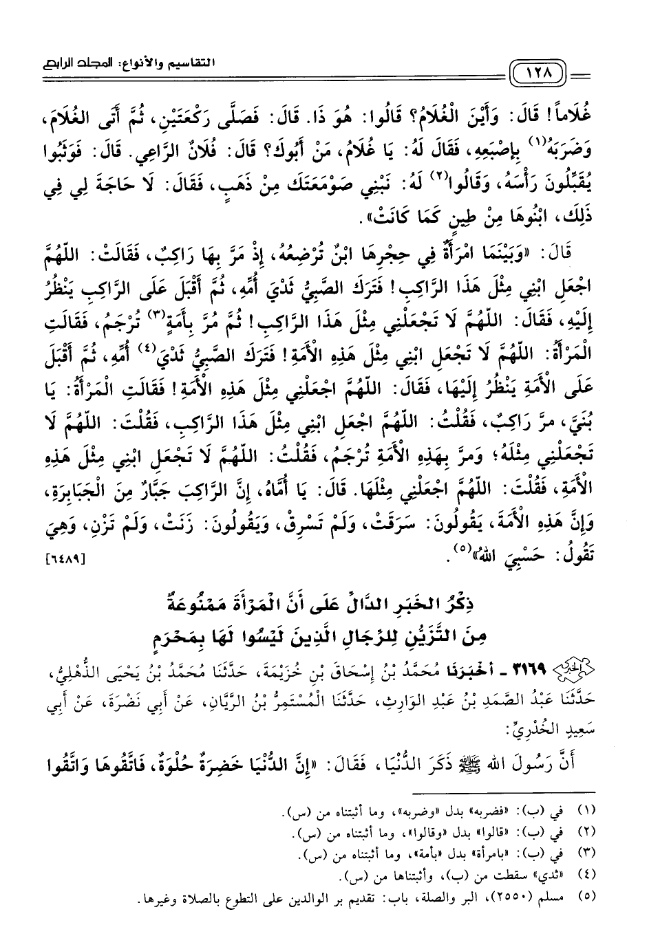 قَالَ: "وَبَيْنَمَا امْرَأَةٌ فِي حِجْرِهَا ابْنٌ تُرْضِعُهُ إِذْ مَرَّ بِهَا رَاكِبٌ، فَقَالَتْ: اللهُمَّ اجْعَلِ ابْنِي مِثْلَ هَذَا الرَّاكِبِ، فَتَرَكَ الصَّبِيُّ ثَدْيَ أُمِّهِ، ثُمَّ أَقْبَلَ عَلَى الرَّاكِبِ يَنْظُرُ إِلَيْهِ، فَقَالَ: اللهُمَّ لَا تَجْعَلْنِي مِثْلَ هَذَا الرَّاكِبِ، ثُمَّ مُرَّ بِأَمَةٍ تُرْجَمُ، فَقَالَتِ الْمَرْأَةُ: اللهُمَّ لَا تَجْعَلِ ابْنِي مِثْلَ هَذِهِ الأَمَةِ فَتَرَكَ الصَّبِيُّ ثدي أُمِّهِ، ثُمَّ أَقْبَلَ عَلَى الأَمَةِ يَنْظُرُ إِلَيْهَا، فَقَالَ: اللهُمَّ اجْعَلْنِي مِثْلَ هَذِهِ الأَمَةِ، فَقَالَتِ الْمَرْأَةُ: يَا بُنَيَّ مَرَّ رَاكِبٌ، فَقُلْتُ: اللهُمَّ اجْعَلِ ابْنِي مِثْلَ هَذَا الرَّاكِبِ، فَقُلْتَ: اللهُمَّ لَا تَجْعَلْنِي مِثْلَهُ، وَمُرَّ بِهَذِهِ الأَمَةِ تُرْجَمُ، فَقُلْتُ: اللهُمَّ لَا تَجْعَلِ ابْنِي مِثْلَ هَذِهِ الأَمَةِ، فَقُلْتَ: اللهُمَّ اجْعَلْنِي مِثْلَهَا، قَالَ: يَا أُمَّاهْ إِنَّ الرَّاكِبَ جَبَّارٌ مِنَ الْجَبَابِرَةِ، وَإِنَّ هَذِهِ الأَمَةَ يَقُولُونَ: سَرَقَتْ وَلَمْ تَسْرِقْ، وَيَقُولُونَ: زَنَتْ وَلَمْ تَزْنِ، وَهِيَ تَقُولُ: حَسْبِيَ اللهُ". [٦٤٨٩]