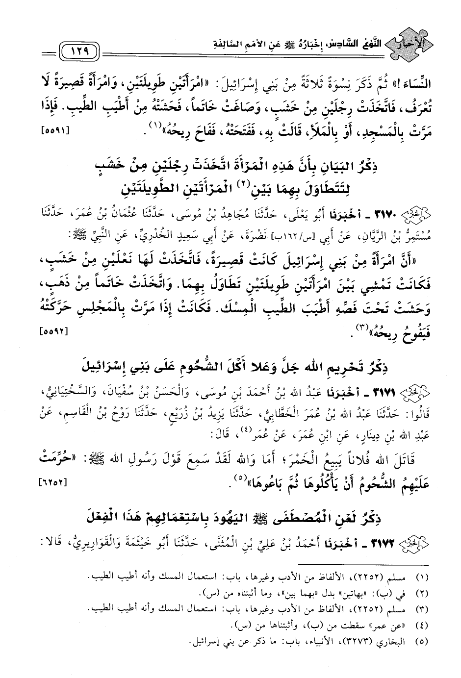 ٣١٧٠ - أَخبَرنا أَبُو يَعْلَى، حَدثنا مُجَاهِدُ بْنُ مُوسَى، حَدثنا عُثْمَانُ بْنُ عُمَرَ، حَدثنا مُسْتَمِرُّ بْنُ الرَّيَّانِ، عَنْ أَبِي نَضْرَةَ، عَنْ أَبِي سَعِيدٍ الْخُدْرِيِّ، عَنِ النَّبِيِّ صَلى الله عَلَيه وسَلم: "أنَّ امْرَأَةً مِنْ بَنِي إِسْرَائِيلَ كَانَتْ قَصِيرَةً، فَاتَّخَذَتْ لَهَا نَعْلَيْنِ مِنْ خَشَبٍ فَكَانَتْ تَمْشِي بَيْنَ امْرَأَتَيْنِ طَوِيلَتَيْنِ تَطَاوَلُ بِهِمَا، وَاتَّخَذَتْ خَاتَمًا مِنْ ذَهَبٍ وَحَشَتْ تَحْتَ فَصِّهِ أَطْيَبَ الطِّيبِ الْمِسْكَ، فَكَانَتْ إِذَا مَرَّتْ بِالْمَجْلِسِ حَرَّكَتْهُ فَيَفُوحُ رِيحُهُ". [٥٥٩٢]