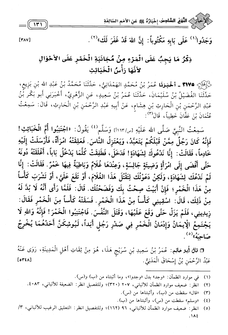 ٣١٧٥ - أَخبَرنا عُمَرُ بْنُ مُحَمَّدٍ الْهَمْدَانِيُّ، حَدثنا مُحَمَّدُ بْنُ عَبْدِ اللهِ بْنِ بَزِيعٍ، حَدثنا الْفُضَيْلُ بْنُ سُلَيْمَانَ، حَدثنا عُمَرُ بْنُ سَعِيدٍ، عَنِ الزُّهْرِيِّ، أَخْبَرَنِي أَبُو بَكْرِ بْنُ عَبْدِ الرَّحْمَنِ بْنِ الْحَارِثِ بْنِ هِشَامٍ، عَنْ أَبِيهِ عَبْدِ الرَّحْمَنِ بْنِ الْحَارِثِ، قَالَ: سَمِعْتُ عُثْمَانَ بْنَ عَفَّانَ خَطِيبًا، قال: سَمِعْتُ النَّبِيَّ صَلى الله عَلَيه وسَلم يَقُولُ: "اجْتَنِبُوا أُمَّ الْخَبَائِثِ، فَإِنَّهُ كَانَ رَجُلٌ مِمَّنْ قَبْلَكُمْ يَتَعَبَّدُ وَيَعْتَزِلُ النَّاسَ، فَعَلِقَتْهُ امْرَأَةٌ فَأَرْسَلَتْ إِلَيْهِ خَادِمًا، فَقَالَتْ: إِنَّا نَدْعُوكَ لِشَهَادَةٍ، فَدَخَلَ فَطَفِقَتْ كُلَّمَا يَدْخُلُ بَابًا أَغْلَقَتْهُ دُونَهُ حَتَّى أَفْضَى إِلَى امْرَأَةٍ وَضِيئَةٍ جَالِسَةٍ، وَعِنْدَهَا غُلَامٌ وَبَاطِيَةٌ فِيهَا خَمْرٌ،