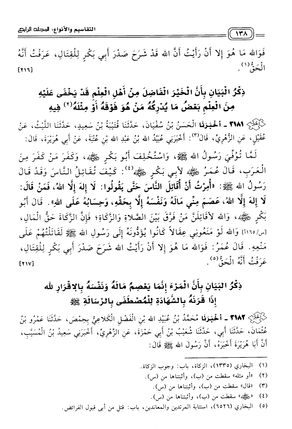 ٣١٨١ - أَخبَرنا الْحَسَنُ بْنُ سُفْيَانَ، حَدثنا قُتَيْبَةُ بْنُ سَعِيدٍ، حَدثنا اللَّيْثُ، عَنْ عُقَيْلٍ، عَنِ الزُّهْرِيِّ، قال: أَخْبَرَنِي عُبَيْدُ اللهِ بْنُ عَبْدِ اللهِ بْنِ عُتْبَةَ، عَنْ أَبِي هُرَيْرَةَ، قَالَ: لَمَّا تُوُفِّيَ رَسُولُ اللهِ صَلى الله عَلَيه وسَلم، وَاسْتُخْلِفَ أَبُو بَكْرٍ رَضِيَ اللهُ عَنْهُ، وَكَفَرَ مَنْ كَفَرَ مِنَ الْعَرَبِ، قَالَ عُمَرُ رَضِيَ اللهُ عَنْهُ لأَبِي بَكْرٍ رَضِيَ اللهُ عَنْهُ: كَيْفَ تُقَاتِلُ النَّاسَ وَقَدْ قَالَ رَسُولُ اللهِ صَلى الله عَلَيه وسَلم: "أُمِرْتُ أَنْ أُقَاتِلَ النَّاسَ حَتَّى يَقُولُوا: لَا إِلَهَ إِلَاّ اللهُ، فَمَنْ قَالَ: لَا إِلَهَ إِلَاّ اللهُ، عَصَمَ مِنِّي مَالَهُ وَنَفْسَهُ إِلَاّ بِحَقِّهِ، وَحِسَابُهُ عَلَى اللهِ". قَالَ أَبُو بَكْرٍ رَضِيَ اللهُ عَنْهُ: وَاللهِ لأُقَاتِلَنَّ مَنْ فَرَّقَ بَيْنَ الصَّلَاةِ وَالزَّكَاةِ، فَإِنَّ الزَّكَاةَ حَقُّ الْمَالِ، وَاللهِ لَوْ مَنَعُونِي عِقَالاً كَانُوا يُؤَدُّونَهُ إِلَى رَسُولِ اللهِ صَلى الله عَلَيه وسَلم لَقَاتَلْتُهُمْ عَلَى مَنْعِهِ، قَالَ عُمَرُ: فَوَاللهِ مَا هُوَ إِلَاّ أَنْ رَأَيْتُ اللهَ شَرَحَ صَدْرَ أَبِي بَكْرٍ لِلْقِتَالِ عَرَفْتُ أَنَّهُ الْحَقُّ. [٢١٧]
