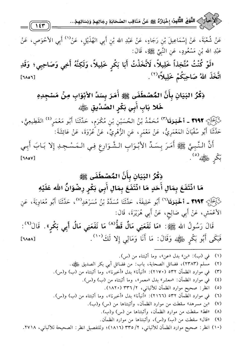 ٣١٩٢ - أَخبَرنا مُحَمَّدُ بْنُ الْحُسَيْنِ بْنِ مُكْرَمٍ، حَدثنا أَبُو مَعْمَرٍ الْقَطِيعِيُّ، حَدثنا أَبُو سُفْيَانَ الْمَعْمَرِيُّ، عَنْ مَعْمَرٍ، عَنِ الزُّهْرِيِّ، عَنْ عُرْوَةَ، عَنْ عَائِشَةَ؛ أَنَّ النَّبِيَّ صَلى الله عَلَيه وسَلم أَمَرَ بِسَدِّ الأَبْوَابِ الشَّوَارِعِ فِي الْمَسْجِدِ إِلَاّ بَابَ أَبِي بَكْرٍ رَضِيَ اللهُ عَنْهُ. [٦٨٥٧]