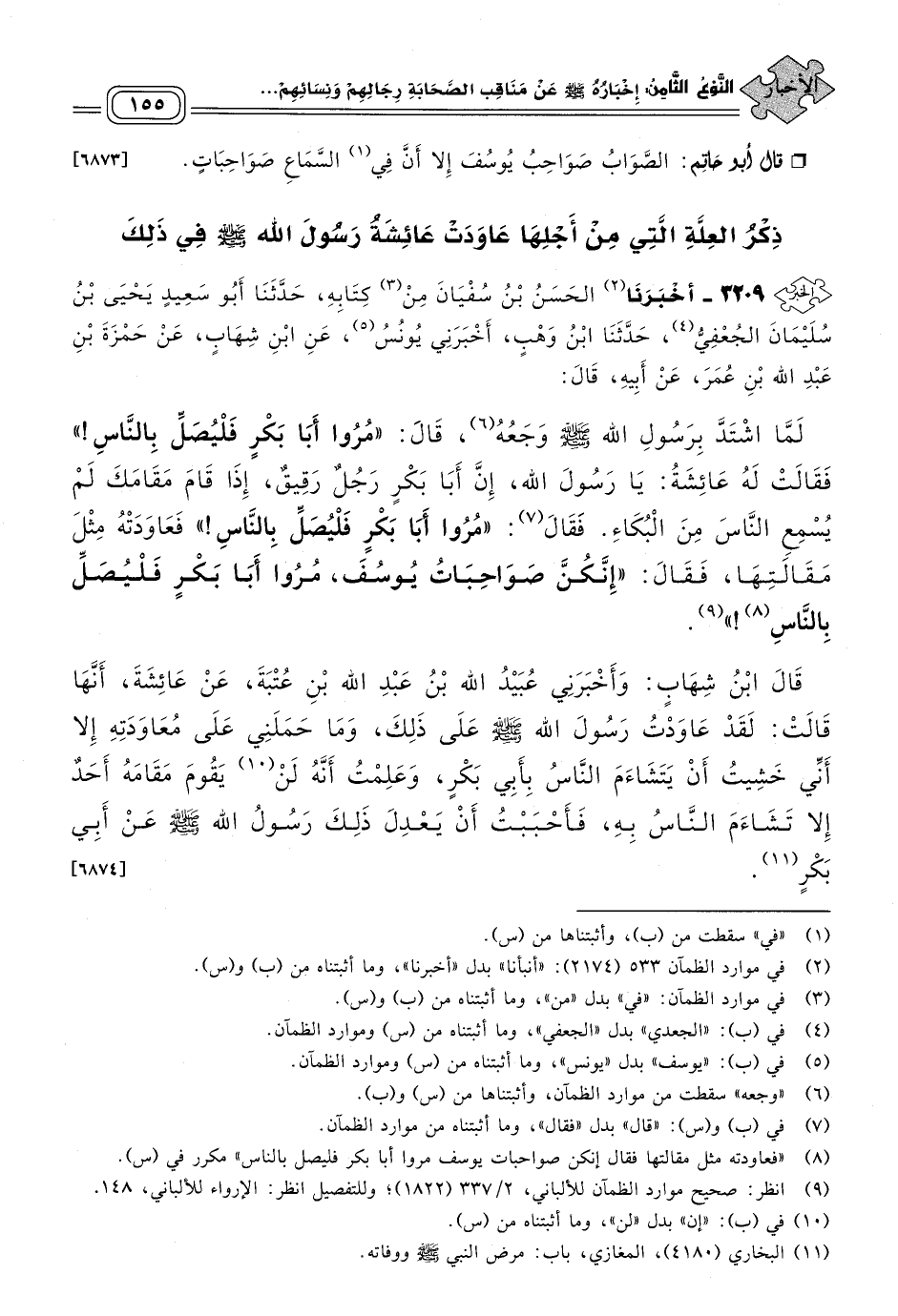 ٣٢٠٩ - أَخبَرنا الْحَسَنُ بْنُ سُفْيَانَ مِنْ كِتَابِهِ، حَدثنا أَبُو سَعِيدٍ يَحْيَى بْنُ سُلَيْمَانَ الْجُعْفِيُّ، حَدثنا ابْنُ وَهْبٍ، أَخْبَرَنِي يُونُسُ، عَنِ ابْنِ شِهَابٍ، عَنْ حَمْزَةَ بْنِ عَبْدِ اللهِ بْنِ عُمَرَ، عَنْ أَبِيهِ، قَالَ: لَمَّا اشْتَدَّ بِرَسُولِ اللهِ صَلى الله عَلَيه وسَلم وَجَعُهُ، قَالَ: "مُرُوا أَبَا بَكْرٍ، فَلْيُصَلِّ بِالنَّاسِ"، فَقَالَتْ لَهُ عَائِشَةُ: يَا رَسُولَ اللهِ، إِنَّ أَبَا بَكْرٍ رَجُلٌ رَقِيقٌ إِذَا قَامَ مَقَامَكَ لَمْ يُسْمِعِ النَّاسَ مِنَ الْبُكَاءِ، فَقَالَ: "مُرُوا أَبَا بَكْرٍ، فَلْيُصَلِّ بِالنَّاسِ"، فَعَاوَدَتْهُ مِثْلَ مقَالَتِهَا، فَقَالَ: "إِنَّكُنَّ صَوَاحِبَاتُ يُوسُفَ، مُرُوا أَبَا بَكْرٍ فَلْيُصَلِّ بِالنَّاسِ".