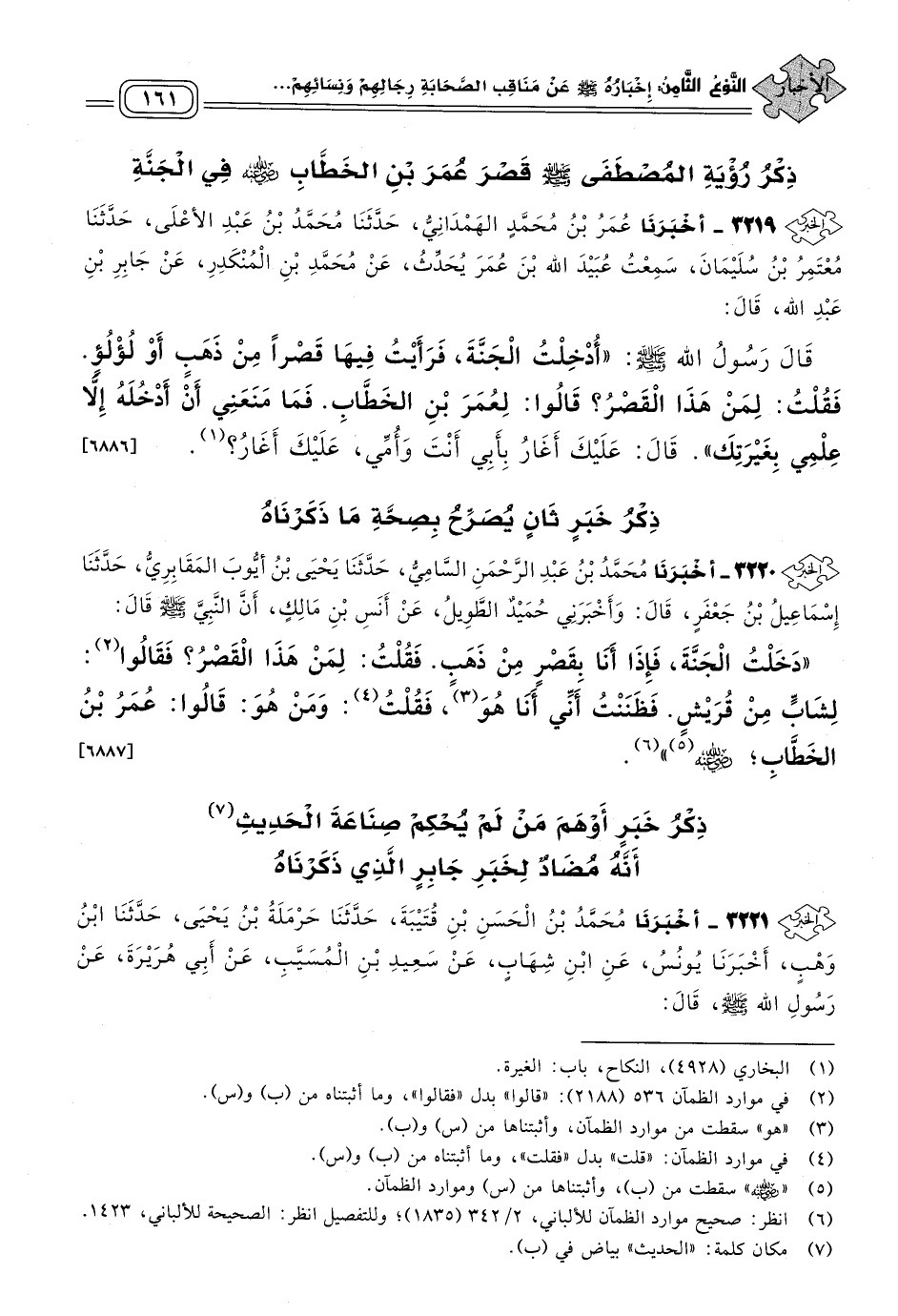 ٣٢١٩ - أَخبَرنا عُمَرُ بْنُ مُحَمَّدٍ الْهَمْدَانِيُّ، حَدثنا مُحَمَّدُ بْنُ عَبْدِ الأَعْلَى، حَدثنا مُعْتَمِرُ بْنُ سُلَيْمَانَ، سَمِعْتُ عُبَيْدَ اللهِ بْنَ عُمَرَ يُحَدِّثُ عَنْ مُحَمَّدِ بْنِ الْمُنْكَدِرِ، عَنْ جَابِرِ بْنِ عَبْدِ اللهِ، قَالَ: قَالَ رَسُولُ اللهِ صَلى الله عَلَيه وسَلم: "أُدْخِلْتُ الْجَنَّةَ فَرَأَيْتُ فِيهَا قَصْرًا مِنْ ذَهَبٍ، أَوْ لُؤْلُؤٍ، فَقُلْتُ: لِمَنْ هَذَا الْقَصْرُ؟ قَالُوا: لِعُمَرَ بْنِ الْخَطَّابِ. فَمَا مَنَعَنِي أَنْ أَدْخُلَهُ إِلَاّ عِلْمِي بِغَيْرَتِكَ"، قَالَ: عَلَيْكَ أَغَارُ بِأَبِي أَنْتَ وَأُمِّي، عَلَيْكَ أَغَارُ؟. [٦٨٨٦]