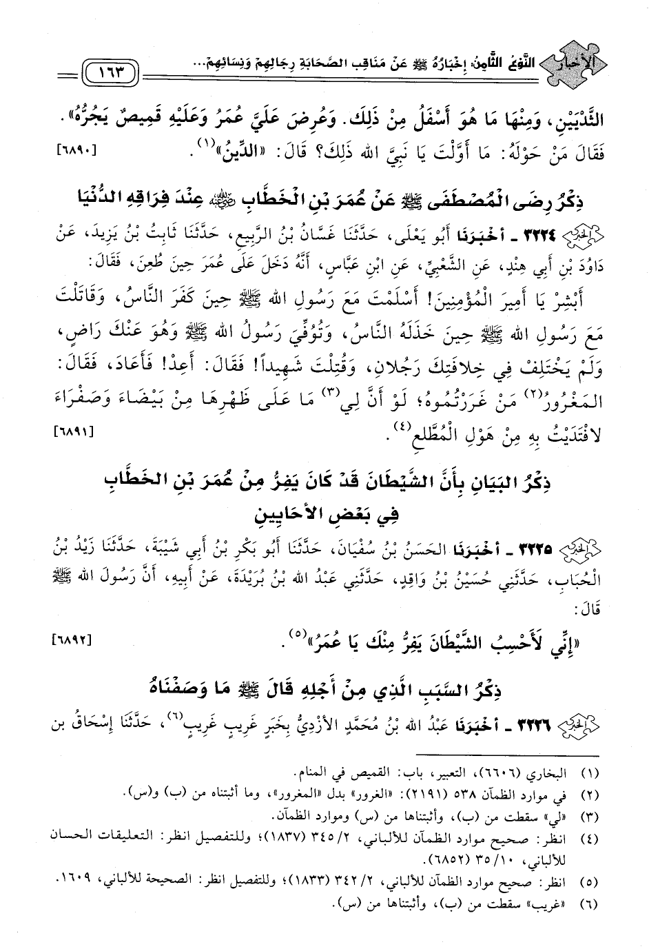 ٣٢٢٦ - أَخبَرنا عَبْدُ اللهِ بْنُ مُحَمَّدٍ الأَزْدِيُّ بِخَبَرٍ غَرِيبٍ غَرِيبٍ، حَدثنا إِسْحَاقُ بْنُ إِبْرَاهِيمَ، حَدثنا يَزِيدُ بْنُ هَارُونَ، حَدثنا إِبْرَاهِيمُ بْنُ سَعْدٍ، عَنْ صَالِحِ بْنِ كَيْسَانَ، عَنِ الزُّهْرِيِّ، عَنْ عَبْدِ الْحَمِيدِ بْنِ عَبْدِ الرَّحْمَنِ بْنِ زَيْدِ بْنِ الْخَطَّابِ، عَنْ مُحَمَّدِ بْنِ سَعْدِ بْنِ أَبِي وَقَّاصٍ، عَنْ أَبِيهِ، أَنَّهُ قَالَ: دَخَلَ عُمَرُ بْنُ الْخَطَّابِ رَضِيَ اللهُ عَنْهُ عَلَى رَسُولِ اللهِ صَلى الله عَلَيه وسَلم، وَعِنْدَهُ نِسْوَةٌ مِنْ قُرَيْشٍ يَسَلْنَهُ وَيَسْتَكْثِرْنَهُ رَافِعَاتٍ أَصْوَاتَهُنَّ، فَلَمَّا سَمِعْنَ صَوْتَ عُمَرَ انْقَمَعْنَ، وَسَكَتْنَ، فَضَحِكَ رَسُولُ اللهِ صَلى الله عَلَيه وسَلم، فَقَالَ عُمَرُ: يَا عُدَيَّاتِ أَنْفُسِهِنَّ، تَهَبْنَنِي وَلَا تَهَبْنَ رَسُولَ اللهِ صَلى الله عَلَيه وسَلم، فَقَالَ رَسُولُ اللهِ صَلى الله عَلَيه وسَلم: "يَا عُمَرُ، مَا لَقِيَكَ الشَّيْطَانُ سَالِكًا فَجًّا إِلَاّ سَلَكَ فَجًّا غَيْرَ فَجِّكَ". [٦٨٩٣]