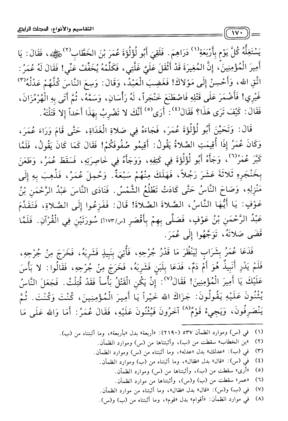 فَلَمَّا كَبَّرَ عمر وَجَأَهُ أَبُو لُؤْلُؤَةَ فِي كَتِفِهِ، وَوَجَأَهُ فِي خَاصِرَتِهِ، فَسَقَطَ عُمَرُ وَطَعَنَ بِخَنْجَرِهِ ثَلَاثَةَ عَشَرَ رَجُلاً، فَهَلَكَ مِنْهُمْ سَبْعَةٌ وَحُمِلَ عُمَرُ، فَذُهِبَ بِهِ إِلَى مَنْزِلِهِ، وَصَاحَ النَّاسُ حَتَّى كَادَتْ تَطْلُعُ الشَّمْسُ، فَنَادَى النَّاسَ عَبْدُ الرَّحْمَنِ بْنُ عَوْفٍ: يَا أَيُّهَا النَّاسُ، الصَّلَاةَ الصَّلَاةَ، قَالَ: فَفَزِعُوا إِلَى الصَّلَاةِ، فَتَقَدَّمَ عَبْدُ الرَّحْمَنِ بْنُ عَوْفٍ، فَصَلَّى بِهِمْ بِأَقْصَرِ سُورَتَيْنِ فِي الْقُرْآنِ، فَلَمَّا قَضَى صَلَاتَهُ تَوَجَّهُوا إِلَى عُمَرَ، فَدَعَا عُمَرُ بِشَرَابٍ لَيَنْظُرَ مَا قَدْرُ جُرْحِهِ، فَأُتِيَ بِنَبِيذٍ فَشَرِبَهُ، فَخَرَجَ مِنْ جُرْحِهِ فَلَمْ يَدْرِ أَنَبِيذٌ هُوَ أَمْ دَمٌ، فَدَعَا بِلَبَنٍ فَشَرِبَهُ فَخَرَجَ مِنْ جُرْحِهِ، فَقَالُوا: لَا بَأْسَ عَلَيْكَ يَا أَمِيرَ الْمُؤْمِنِينَ، فَقَالَ: إِنْ يَكُنِ الْقَتْلُ بَأْسًا فَقَدْ قُتِلْتُ، فَجَعَلَ النَّاسُ يُثْنُونَ عَلَيْهِ يَقُولُونَ: جَزَاكَ اللهُ خَيْرًا يَا أَمِيرَ الْمُؤْمِنِينَ، كُنْتَ وَكُنْتَ، ثُمَّ يَنْصَرِفُونَ، وَيَجِيءُ قَوْمٌ آخَرُونَ، فَيُثْنُونَ عَلَيْهِ، فَقَالَ عُمَرُ: أَمَا وَاللهِ عَلَى مَا تَقُولُونَ، وَدِدْتُ أَنِّي خَرَجْتُ مِنْهَا كَفَافًا لَا عَلَيَّ وَلَا لِي، وَأَنَّ صُحْبَةَ رَسُولِ اللهِ صَلى الله عَلَيه وسَلم سَلِمَتْ لِي، فَتَكَلَّمَ عَبْدُ اللهِ بْنُ عَبَّاسٍ، وَكَانَ عِنْدَ رَأْسِهِ، وَكَانَ خَلِيطَهُ كَأَنَّهُ مِنْ أَهْلِهِ، وَكَانَ ابْنُ عَبَّاسٍ يُقْرِئُهُ الْقُرْآنَ،