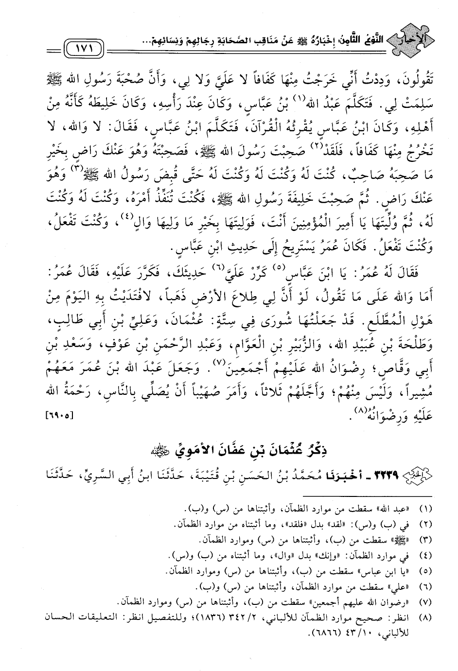 فَقَالَ لَهُ عُمَرُ: يا ابن عباس كَرِّرْ عَلَيَّ حَدِيثَكَ، فَكَرَّرَ عَلَيْهِ، فَقَالَ عُمَرُ: أَمَا وَاللهِ عَلَى مَا تَقُولُ، لَوْ أَنَّ لِي طِلَاعَ الأَرْضِ ذَهَبًا لَافْتَدَيْتُ بِهِ الْيَوْمَ مِنْ هَوْلِ الْمُطَّلَعِ، قَدْ جَعَلْتُهَا شُورَى فِي سِتَّةٍ: عُثْمَانَ، وَعَلِيِّ بْنِ أَبِي طَالِبٍ، وَطَلْحَةَ بْنِ عُبَيْدِ اللهِ، وَالزُّبَيْرِ بْنِ الْعَوَّامِ، وَعَبْدِ الرَّحْمَنِ بْنِ عَوْفٍ، وَسَعْدِ بْنِ أَبِي وَقَّاصٍ، رضوان الله عليهم أجمعين، وَجَعَلَ عَبْدَ اللهِ بْنَ عُمَرَ مَعَهُمْ مُشِيرًا، وَلَيْسَ مِنْهُمْ، وَأَجَّلَهُمْ ثَلَاثًا، وَأَمَرَ صُهَيْبًا أَنْ يُصَلِّيَ بِالنَّاسِ، رَحْمَةُ اللهِ عَلَيْهِ وَرِضْوَانُهُ. [٦٩٠٥]
