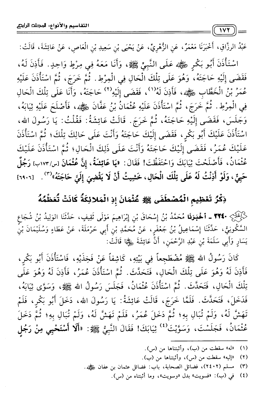 ٣٢٤٠ - أَخبَرنا مُحَمَّدُ بْنُ إِسْحَاقَ بْنِ إِبْرَاهِيمَ، مَوْلَى ثَقِيفٍ، حَدثنا الْوَلِيدُ بْنُ شُجَاعٍ السَّكُونِيُّ، حَدثنا إِسْمَاعِيلُ بْنُ جَعْفَرٍ، عَنْ مُحَمَّدِ بْنِ أَبِي حَرْمَلَةَ، عَنْ عَطَاءٍ، وَسُلَيْمَانَ بْنِ يَسَارٍ، وَأَبِي سَلَمَةَ بْنِ عَبْدِ الرَّحْمَنِ، أَنَّ عَائِشَةَ رَضِيَ اللهُ عَنْهَا، قَالَتْ: كَانَ رَسُولُ اللهِ صَلى الله عَلَيه وسَلم مُضْطَجِعًا فِي بَيْتِهِ كَاشِفًا عَنْ فَخِذَيْهِ، فَاسْتَأْذَنَ أَبُو بَكْرٍ، فَأَذِنَ لَهُ وَهُوَ عَلَى تِلْكَ الْحَالِ، فَتَحَدَّثَ، ثُمَّ اسْتَأْذَنَ عُمَرُ، فَأَذِنَ لَهُ، وَهُوَ عَلَى تِلْكَ الْحَالِ، فَتَحَدَّثَ، ثُمَّ اسْتَأْذَنَ عُثْمَانُ، فَجَلَسَ رَسُولُ اللهِ صَلى الله عَلَيه وسَلم وَسَوَّى ثِيَابَهُ، فَدَخَلَ فَتَحَدَّثَ، فَلَمَّا خَرَجَ، قَالَتْ عَائِشَةُ: يَا رَسُولَ اللهِ، دَخَلَ أَبُو بَكْرٍ، فَلَمْ تَهَشَّ لَهُ، وَلَمْ تُبَالِ بِهِ، ثُمَّ دَخَلَ عُمَرُ، فَلَمْ تَهَشَّ لَهُ، وَلَمْ تُبَالِ بِهِ، ثُمَّ دَخَلَ عُثْمَانُ، فَجَلَسْتَ وَسَوَّيْتَ ثِيَابَكَ، فَقَالَ النَّبِيُّ صَلى الله عَلَيه وسَلم: "أَلَا أَسْتَحْيي مِنْ رَجُلٍ تَسْتَحْيي مِنْهُ الْمَلَائِكَةُ". [٦٩٠٧]