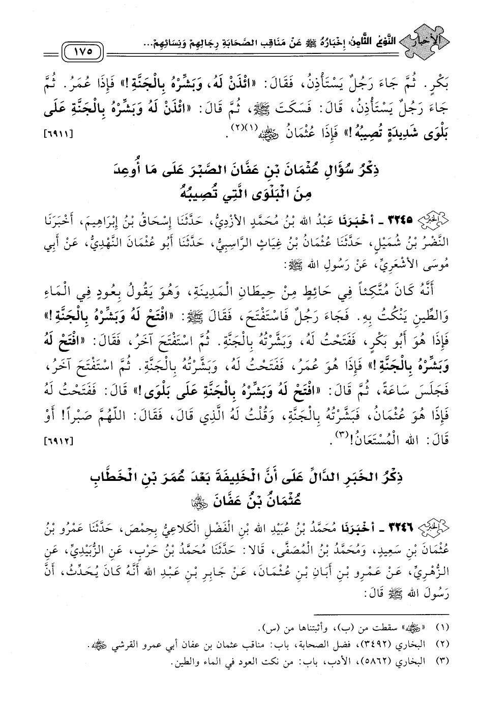 ٣٢٤٥ - أَخبَرنا عَبْدُ اللهِ بْنُ مُحَمَّدٍ الأَزْدِيُّ، حَدثنا إِسْحَاقُ بْنُ إِبْرَاهِيمَ، أَخبَرنا النَّضْرُ بْنُ شُمَيْلٍ، حَدثنا عُثْمَانُ بْنُ غِيَاثٍ الرَّاسِبِيُّ، حَدثنا أَبُو عُثْمَانَ النَّهْدِيُّ، عَنْ أَبِي مُوسَى الأَشْعَرِيِّ، عَنِ رَسُولِ اللهِ صَلى الله عَلَيه وسَلم: أَنَّهُ كَانَ مُتَّكِئًا فِي حَائِطٍ مِنْ حِيطَانِ الْمَدِينَةِ وَهُوَ يَقُولُ بِعُودٍ فِي الْمَاءِ وَالطِّينِ يَنْكُتُ بِهِ، فَجَاءَ رَجُلٌ فَاسْتَفْتَحَ، فَقَالَ صَلى الله عَلَيه وسَلم: "افْتَحْ لَهُ وَبَشِّرْهُ بِالْجَنَّةِ"، فَإِذَا هُوَ أَبُو بَكْرٍ، فَفَتَحْتُ لَهُ وَبَشَّرْتُهُ بِالْجَنَّةِ، ثُمَّ اسْتَفْتَحَ آخَرُ، فَقَالَ: "افْتَحْ لَهُ وَبَشِّرْهُ بِالْجَنَّةِ"، فَإِذَا هُوَ عُمَرُ، فَفَتَحْتُ لَهُ وَبَشَّرْتُهُ بِالْجَنَّةِ، ثُمَّ اسْتَفْتَحَ آخَرُ فَجَلَسَ سَاعَةً، ثُمَّ قَالَ: "افْتَحْ لَهُ وَبَشِّرْهُ بِالْجَنَّةِ عَلَى بَلْوَى"، قَالَ: فَفَتَحْتُ لَهُ فَإِذَا هُوَ عُثْمَانُ، فَبَشَّرْتُهُ بِالْجَنَّةِ، وَقُلْتُ لَهُ الَّذِي قَالَ، فَقَالَ: اللهُمَّ صَبْرًا، أَوْ قَالَ: اللهُ الْمُسْتَعَانُ. [٦٩١٢]