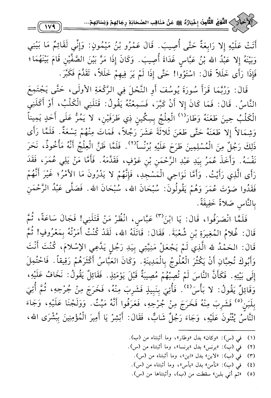 قَالَ: وَرُبَّمَا قَرَأَ سُورَةَ يُوسُفَ أَوِ النَّحْلِ فِي الرَّكْعَةِ الأُولَى، حَتَّى يَجْتَمِعَ النَّاسُ، قَالَ: فَمَا كَانَ إِلَاّ أَنْ كَبَّرَ، فَسَمِعْتُهُ يَقُولُ: قَتَلَنِي الْكَلْبُ، أَوْ أَكَلَنِي الْكَلْبُ، حِينَ طَعَنَهُ وَطَارَ الْعِلْجُ بِسِكِّينٍ ذِي طَرَفَيْنِ لَا يَمُرُّ عَلَى أَحَدٍ يَمِينًا وَشِمَالاً إِلَاّ طَعَنَهُ، حَتَّى طَعَنَ ثَلَاثَةَ عَشَرَ رَجُلاً، فَمَاتَ مِنْهُمْ تِسْعَةٌ، فَلَمَّا رَأَى ذَلِكَ رَجُلٌ مِنَ الْمُسْلِمِينَ، طَرَحَ عَلَيْهِ بُرْنُسًا، فَلَمَّا ظَنَّ الْعِلْجُ أَنَّهُ مَأْخُوذٌ نَحَرَ نَفْسَهُ، وَأَخَذَ عُمَرُ بِيَدِ عَبْدِ الرَّحْمَنِ بْنِ عَوْفٍ فَقَدَّمَهُ، فَأَمَّا مَنْ يَلِي عُمَرَ فَقَدْ رَأَى الَّذِي رَأَيْتُ، وَأَمَّا نَوَاحِي الْمَسْجِدِ، فَإِنَّهُمْ لَا يَدْرُونَ مَا الأَمْرُ، غَيْرَ أَنَّهُمْ فَقَدُوا صَوْتَ عُمَرَ وَهُمْ يَقُولُونَ: سُبْحَانَ اللهِ، سُبْحَانَ اللهِ، فَصَلَّى عَبْدُ الرَّحْمَنِ بِالنَّاسِ صَلَاةً خَفِيفَةً، فَلَمَّا انْصَرَفُوا، قَالَ: يَا ابْنَ عَبَّاسٍ، انْظُرْ مَنْ قَتَلَنِي؟ فَجَالَ سَاعَةً، ثُمَّ قَالَ: غُلَامُ الْمُغِيرَةِ بْنِ شُعْبَةَ، فَقَالَ: قَاتَلَهُ اللهُ، لَقَدْ كُنْتُ أَمَرْتُهُ بِمَعْرُوفٍ، ثُمَّ قَالَ: الْحَمْدُ للهِ الَّذِي لَمْ يَجْعَلْ مَنِيَّتِي بِيَدِ رَجُلٍ يَدَّعِي الإِسْلَامَ، كُنْتَ أَنْتَ وَأَبُوكَ تُحِبَّانِ أَنْ يَكْثُرَ الْعُلُوجُ بِالْمَدِينَةِ.