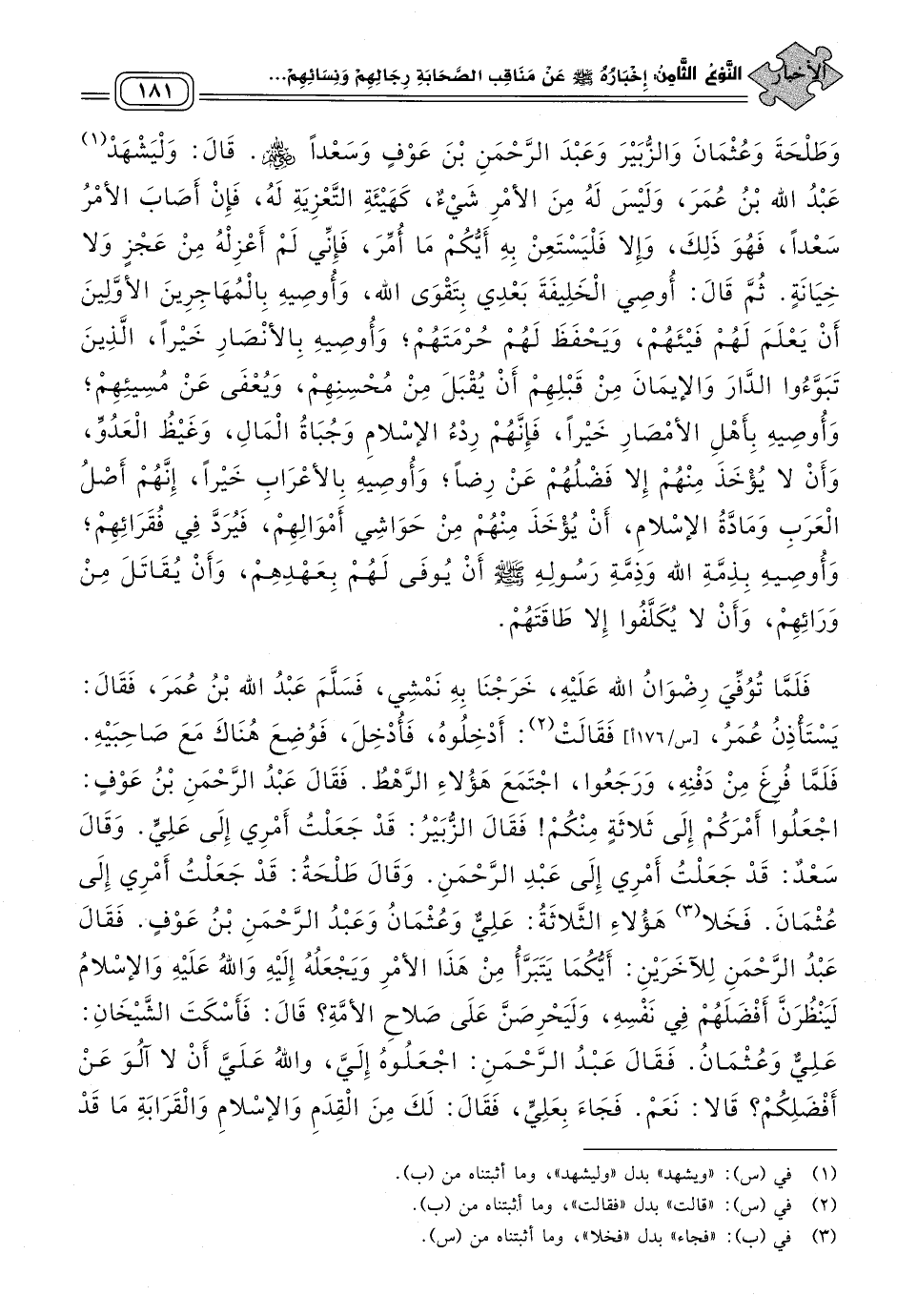 قَالَ: وَلْيَشْهَدْ عَبْدُ اللهِ بْنُ عُمَرَ، وَلَيْسَ لَهُ مِنَ الأَمْرِ شَيْءٌ، كَهَيْئَةِ التَّعْزِيَةِ لَهُ، فَإِنْ أَصَابَ الأَمْرُ سَعْدا، فَهُوَ ذَلِكَ، وَإِلَاّ فَلْيَسْتَعِنْ بِهِ أَيُّكُمْ مَا أُمِّرَ، فَإِنِّي لَمْ أَعْزِلْهُ مِنْ عَجْزٍ وَلَا خِيَانَةٍ، ثُمَّ قَالَ: أُوصِي الْخَلِيفَةَ بَعْدِي بِتَقْوَى اللهِ، وَأُوصِيهِ بِالْمُهَاجِرِينَ الأَوَّلِينَ، أَنْ يَعْلَمَ لَهُمْ فَيْئَهُمْ، وَيَحْفَظَ لَهُمْ حُرْمَتَهُمْ، وَأُوصِيهِ بِالأَنْصَارِ خَيْرًا، الَّذِينَ تَبَوَّءُوا الدَّارَ وَالإِيمَانَ مِنْ قَبْلِهِمْ أَنْ يُقْبَلَ مِنْ مُحْسِنِهِمْ، وَيُعْفَى عَنْ مُسِيئِهِمْ، وَأُوصِيهِ بِأَهْلِ الأَمْصَارِ خَيْرًا، فَإِنَّهُمْ رِدْءُ الإِسْلَامِ، وَجُبَاةُ الْمَالِ، وَغَيْظُ الْعَدُوِّ، وَأَنْ لَا يُؤْخَذَ مِنْهُمْ إِلَاّ فَضْلُهُمْ عَنْ رِضًا، وَأُوصِيهِ بِالأَعْرَابِ خَيْرًا، إِنَّهُمْ أَصْلُ الْعَرَبِ، وَمَادَّةُ الإِسْلَامِ أَنْ يُؤْخَذَ مِنْهُمْ مِنْ حَوَاشِي أَمْوَالِهِمْ، فَيُرَدَّ فِي فُقَرَائِهِمْ، وَأُوصِيهِ بِذِمَّةِ اللهِ، وَذِمَّةِ رَسُولِهِ صَلى الله عَلَيه وسَلم أَنْ يُوَفَّى لَهُمْ بِعَهْدِهِمْ، وَأَنْ يُقَاتَلَ مِنْ وَرَائِهِمْ، وَأَنْ لَا يُكَلَّفُوا إِلَاّ طَاقَتُهُمْ.