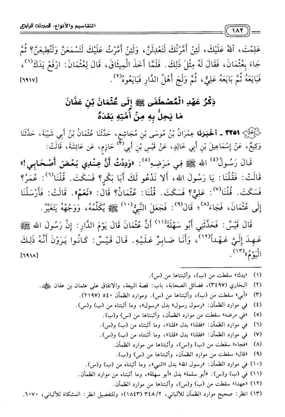 ذِكْرُ عَهْدِ الْمُصْطَفَى صَلى الله عَلَيه وسَلم إِلَى عُثْمَانَ بْنِ عَفَّانَ مَا يَحِلُّ بِهِ مِنْ أُمَّتِهِ بَعْدَهُ.