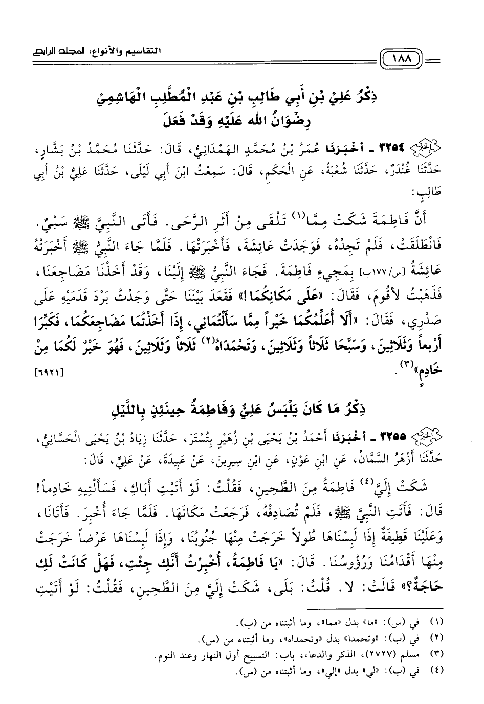 ٣٢٥٤ - أَخبَرنا عُمَرُ بْنُ مُحَمَّدٍ الْهَمْدَانِيُّ، قال: حَدثنا مُحَمَّدُ بْنُ بَشَّارٍ، حَدثنا غُنْدَرٌ، حَدثنا شُعْبَةُ، عَنِ الْحَكَمِ، قَالَ: سَمِعْتُ ابْنَ أَبِي لَيْلَى، حَدثنا عَلِيُّ بْنُ أَبِي طَالِبٍ، أَنَّ فَاطِمَةَ شَكَتْ مِمَّا تَلْقَى مِنْ أَثَرِ الرَّحَى، فَأَتَى النَّبِيَّ صَلى الله عَلَيه وسَلم سَبْيٌ، فَانْطَلَقَتْ، فَلَمْ تَجِدْهُ فَوَجَدَتْ عَائِشَةَ فَأَخْبَرَتْهَا، فَلَمَّا جَاءَ النَّبِيُّ صَلى الله عَلَيه وسَلم أَخْبَرَتْهُ عَائِشَةُ بِمَجِيءِ فَاطِمَةَ، فَجَاءَ النَّبِيُّ صَلى الله عَلَيه وسَلم إِلَيْنَا وَقَدْ أَخَذْنَا مَضَاجِعَنَا فَذَهَبْتُ لأَقُومَ، فَقَالَ: "عَلَى مَكَانِكُمَا"، فَقَعَدَ بَيْنَنَا حَتَّى وَجَدْتُ بَرْدَ قَدَمَيْهِ عَلَى صَدْرِي، فَقَالَ: "أَلَا أُعَلِّمُكُمَا خَيْرًا مِمَّا سَأَلْتُمَانِي، إِذَا أَخَذْتُمَا مَضَاجِعَكُمَا، فَكَبِّرَا أَرْبَعًا وَثَلَاثِينَ، وَسَبِّحَا ثَلَاثًا وَثَلَاثِينَ، وَتَحْمَدَاهُ ثَلَاثًا وَثَلَاثِينَ، فَهُوَ خَيْرٌ لَكُمَا مِنْ خَادِمٍ. [٦٩٢١]