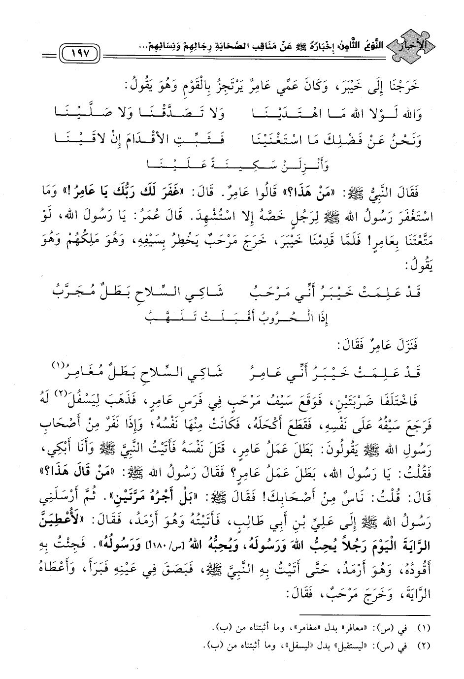 فَاخْتَلَفَا ضَرْبَتَيْنِ فَوَقَعَ سَيْفُ مَرْحَبٍ فِي فَرَسِ عَامِرٍ فَذَهَبَ لِيَسْفُلَ لَهُ فَرَجَعَ سَيْفُهُ عَلَى نَفْسِهِ، فَقَطَعَ أَكْحَلَهُ، فَكَانَتْ مِنْهَا نَفْسُهُ، وَإِذَا نَفَرٌ مِنْ أَصْحَابِ رَسُولِ اللهِ صَلى الله عَلَيه وسَلم يَقُولُونَ: بَطَلَ عَمَلُ عَامِرٍ، قَتَلَ نَفْسَهُ، فَأَتَيْتُ النَّبِيَّ صَلى الله عَلَيه وسَلم وَأَنَا أَبْكِي، فَقُلْتُ: يَا رَسُولَ اللهِ، بَطَلَ عَمَلُ عَامِرٍ؟ فَقَالَ رَسُولُ اللهِ صَلى الله عَلَيه وسَلم: "مَنْ قَالَ هَذَا؟ " قَالَ: قُلْتُ: نَاسٌ مِنْ أَصْحَابِكَ، فَقَالَ صَلى الله عَلَيه وسَلم: "بَلْ أَجْرُهُ مَرَّتَيْنِ".